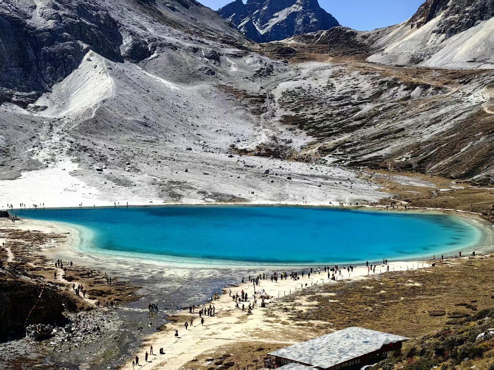 牛奶海,这个名字听起来就让人觉得温柔。亲眼见到的那一刻,我才明白为什么它叫这个名字。冰川遗落的水滴,形成了这片湖泊,奶白色的湖水镶着翠蓝的边,在海拔4600米的山坳里泛着圣洁的光!这哪里是湖,分明是神仙遗落在人间的宝石!我歇了歇,喘匀了气,继续向最终目的地进发。