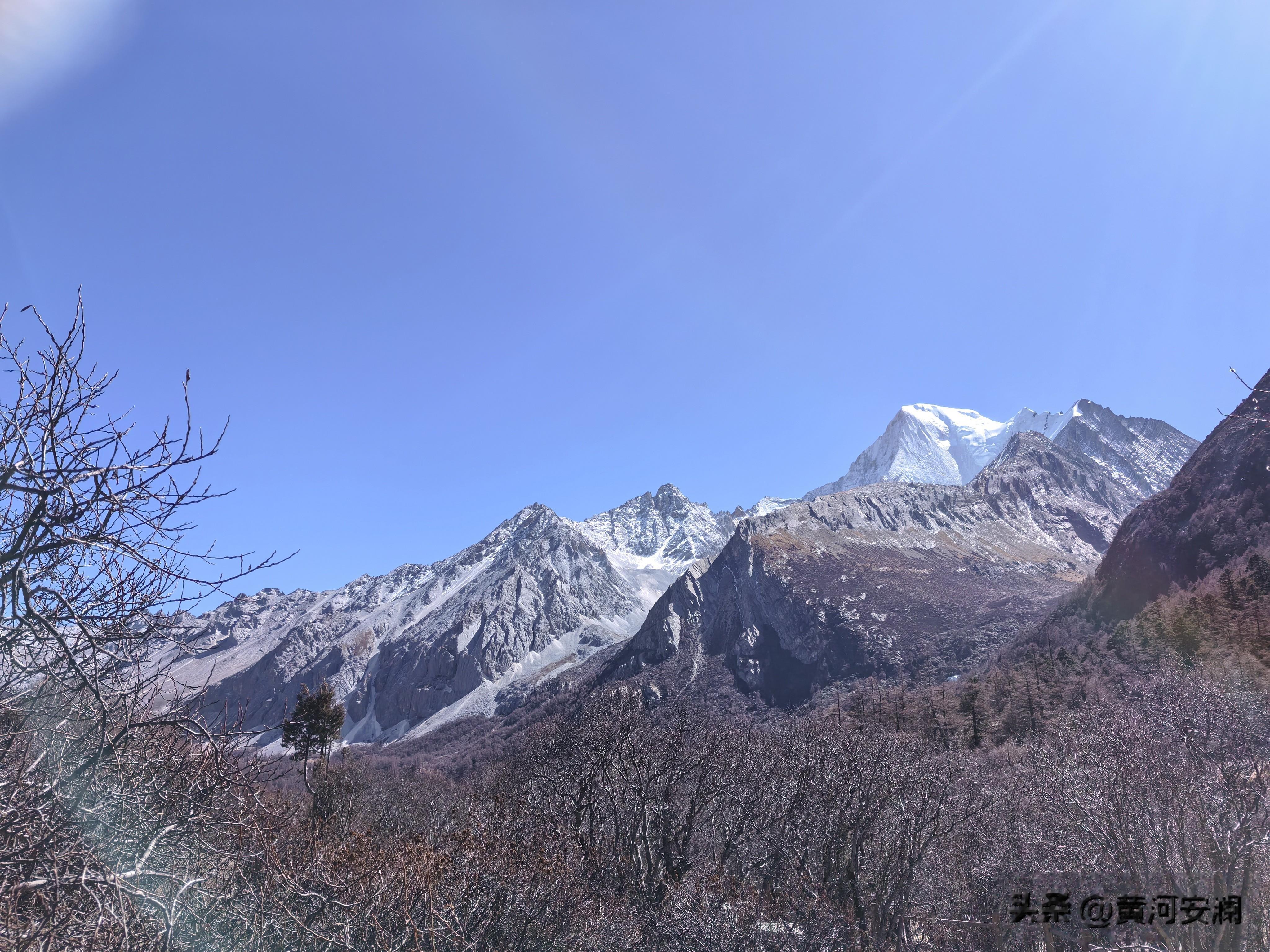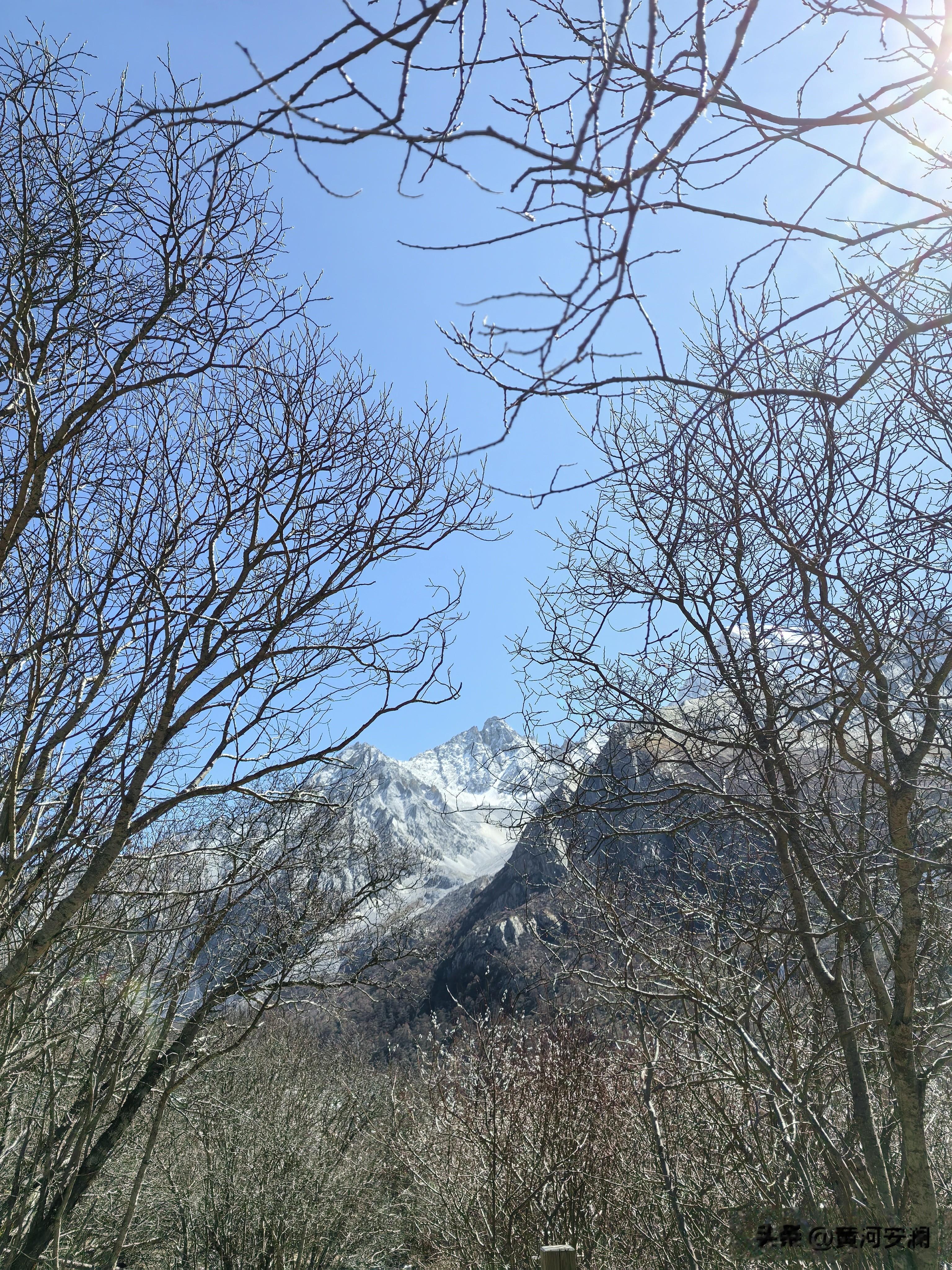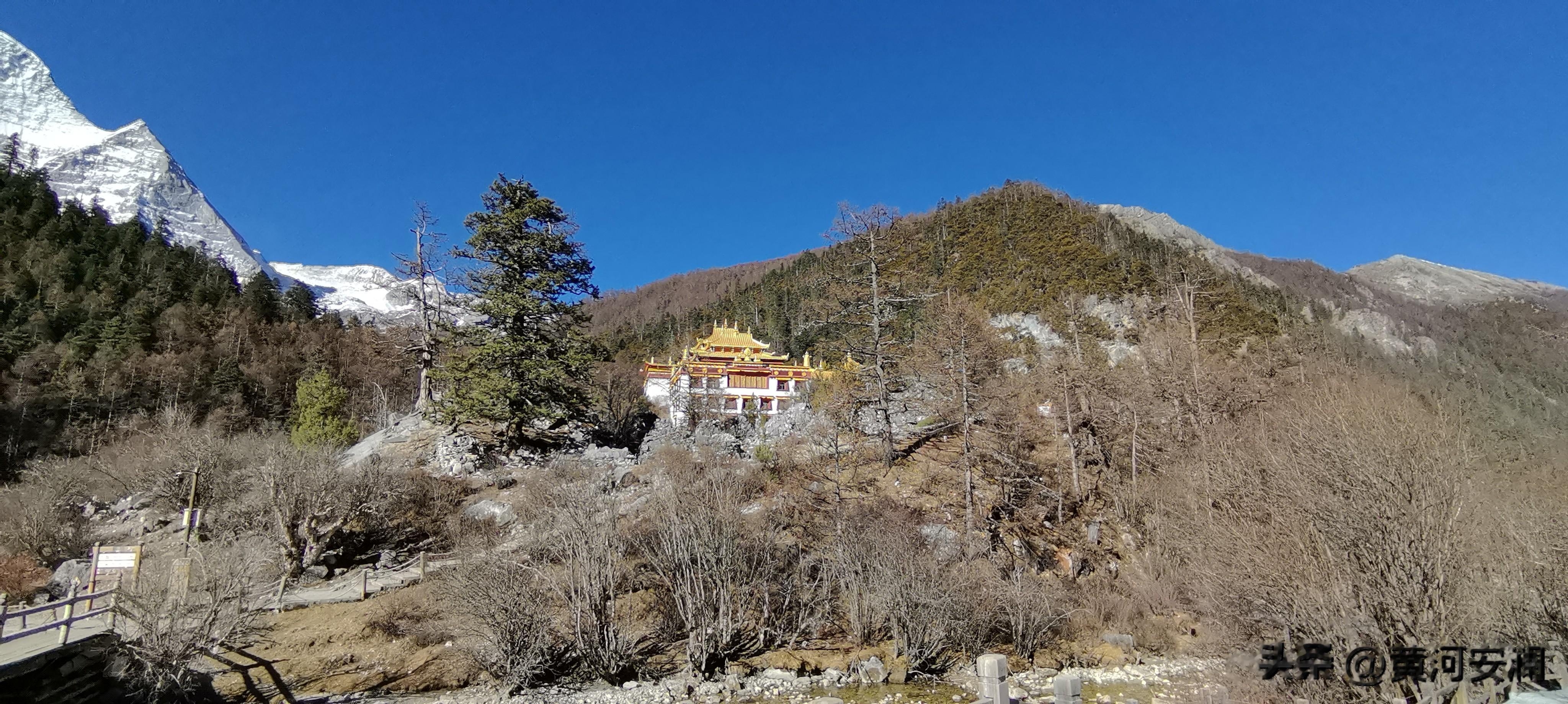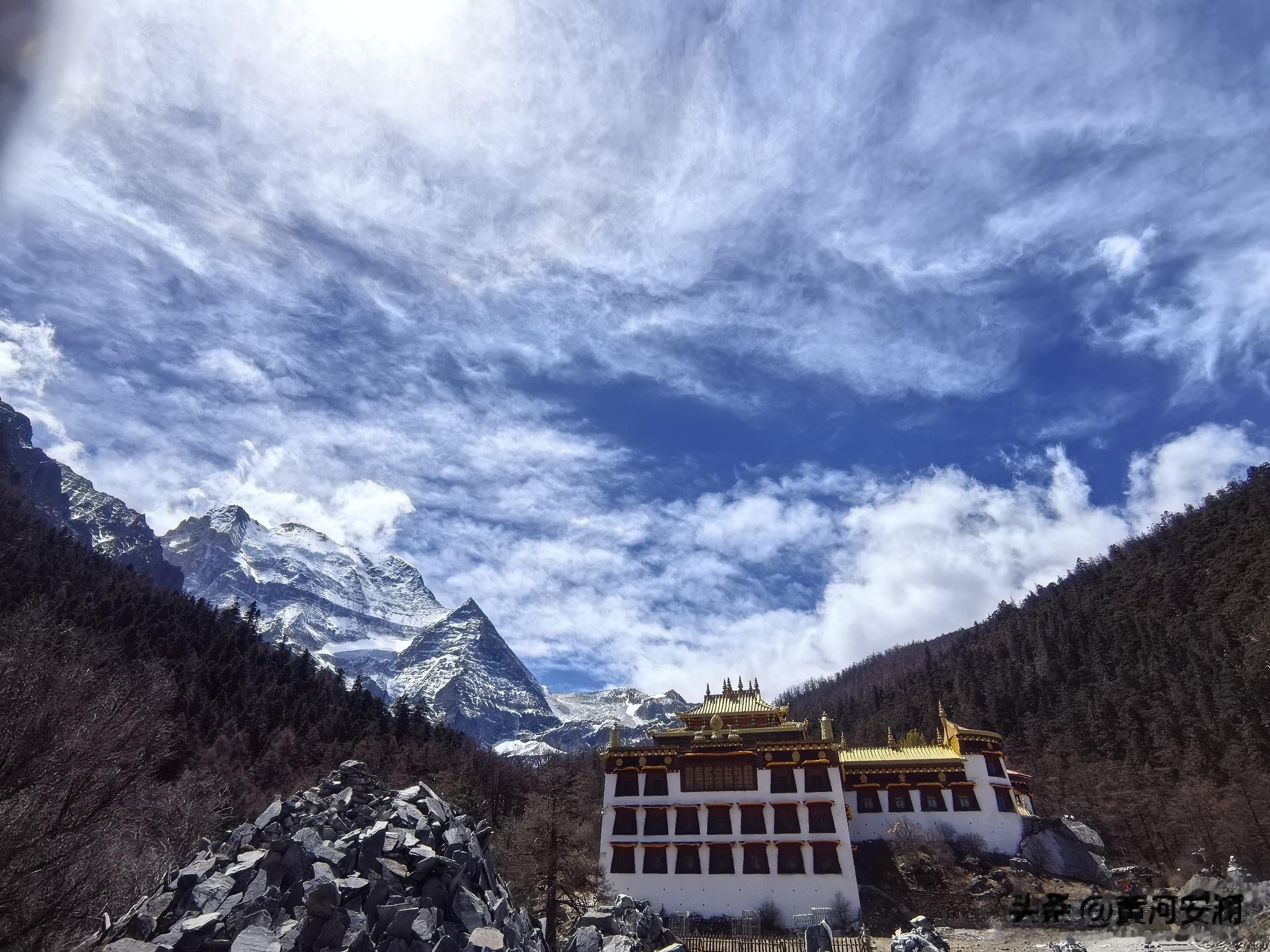 跟猴子们"告别"后,我决定先走短线,给身体一个适应的过程。海拔3880米处,冲古寺静静地伫立在雪山脚下。红墙金顶,在蓝天白云的映衬下格外庄严。寺里传来阵阵梵音,和着雪山的静谧,竟然显得格外的协调、恬静。那一刻,感觉整个人都被洗涤了,城市的喧嚣、工作的烦恼,统统被抛到了九霄云外。
