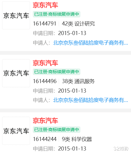 后续,京东还陆续申请了“京东车惠”“京东汽车商城”“京东汽车 JD AUTO”“京东汽车 CAR.JD.COM”商标,国际分类为运输工具、科学仪器、广告销售等,当前部分商标已注册成功。
