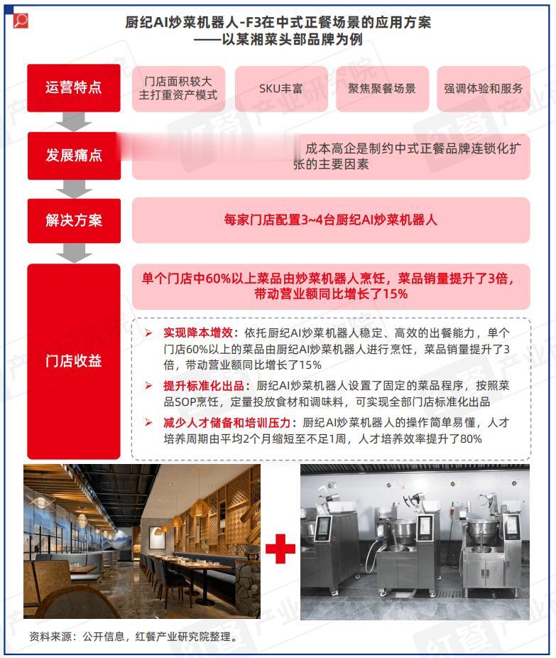2.中式正餐场景:有效解决人力成本高昂、人才培养困难等核心问题,进一步提升门店标准化程度在中式正餐场景中,餐饮门店同样也面临出品标准化难、出餐效率低、成本居高不下等难题。其中,由于中式正餐主打重资产模式,高昂的成本是制约品牌门店扩张的主要因素。在智能化浪潮之下,部分湘菜品牌通过引入厨纪AI炒菜机器人缓解人工压力、提升出品稳定性。