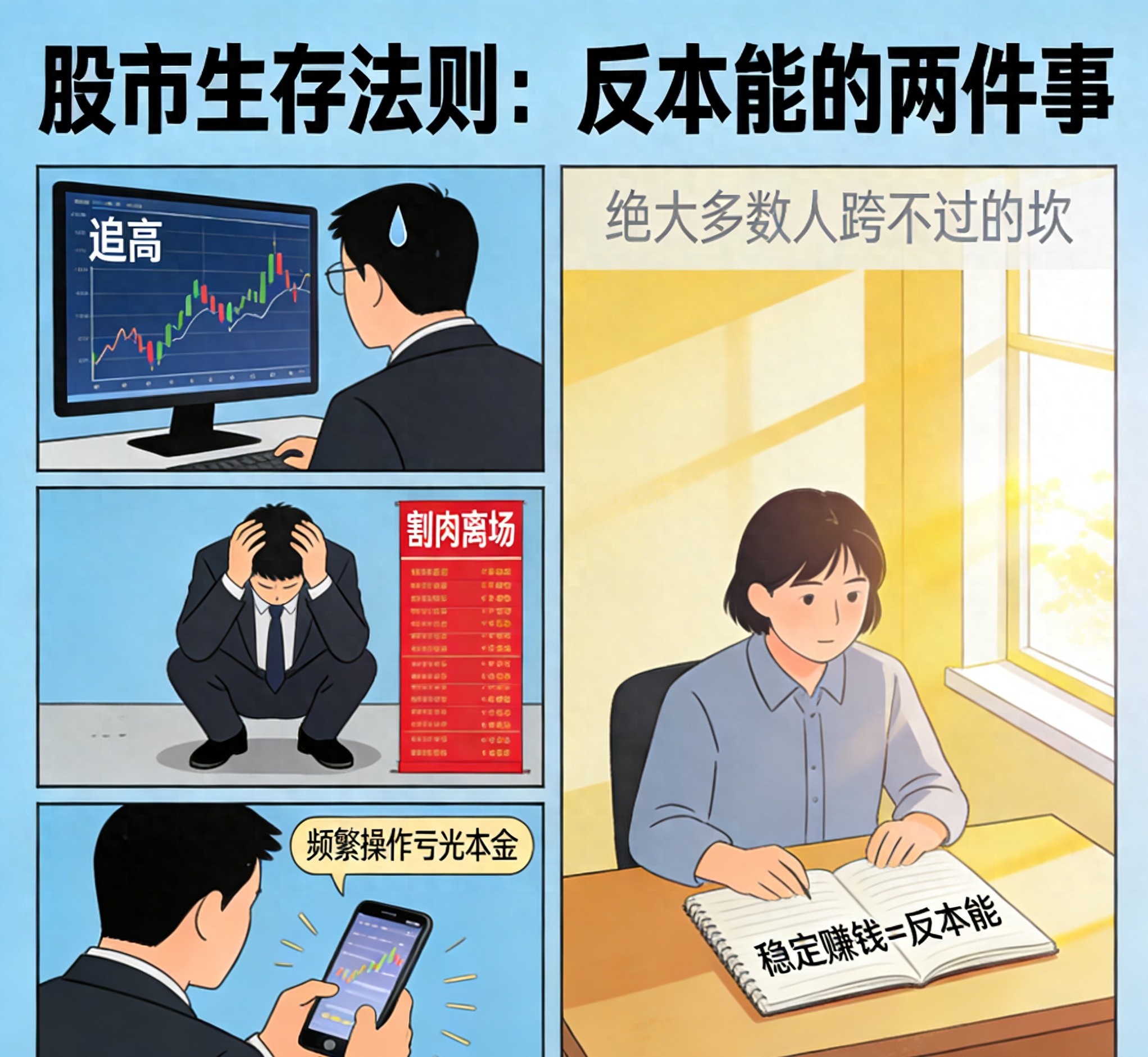 没错,股市赚钱的逻辑本就不复杂,复杂的是战胜自己的本能。99%的人做不到,根源就在刻在骨子里的贪心与焦虑:账户里躺着资金,就忍不住想满仓进场,不操作就觉得错失了机会;手里拿着股票,涨了舍不得卖,跌了不敢加仓,完全被情绪牵着走。