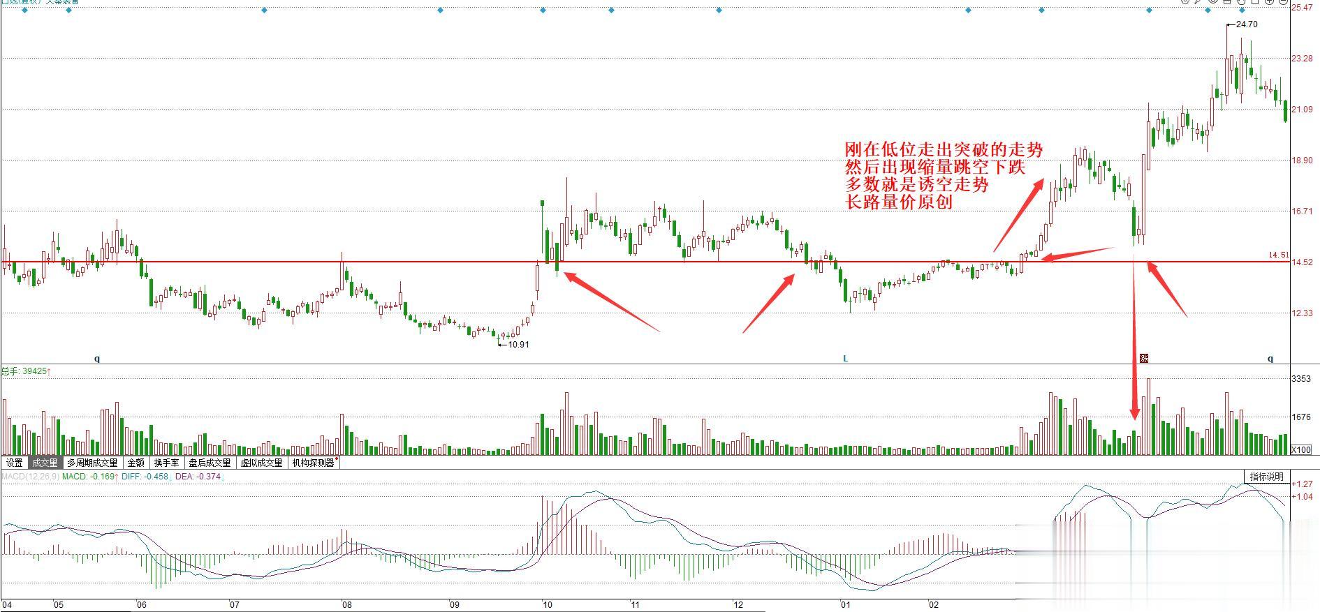 那么如果是这种情况下突然出现了低开,而一般只要是这种情况下出现的低开多数还会是放量的,那么这种放量低开的走势,就是说明要把上面进场的筹码套住,而这种跳空缺口就是逃逸性跳空下跌缺口。