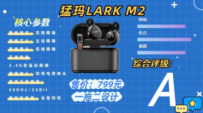 猛玛LARK M2主打高性能便携收音,采用的是双发射器单接收器配置,并配备了专用的充电收纳盒,在便携性与专业性能之间实现比较良好的平衡。发射器体积较紧凑,重量比较轻,支持磁吸与衣夹的佩戴方式,旋转夹设计可以比较灵活调节收音角度,长时间使用也不会造成明显负担。充电收纳盒采用一体化设计,可收纳装有配件的发射器,并提供专门空间存放转接线,便于外出携带与整理。接收器配备高清显示屏和操作拨轮,可直观查看电量、增益及其他录音参数,同时支持猛玛官方App调节与固件升级。