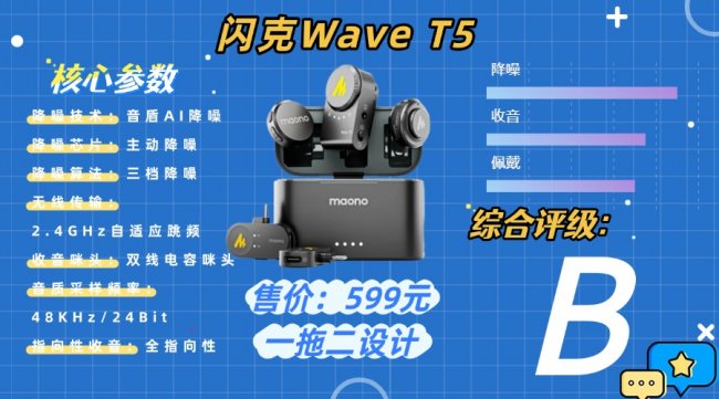 在音质表现方面,Wave T5支持高采样率无线传输协议,搭载优化后的全指向拾音单元,频率响应宽广,能够准确捕捉人声细节,同时对常见环境噪声具有良好的抑制能力,录制效果清晰自然。无线信号稳定,延迟低且抗干扰性能较强,可在开放与室内环境中保持可靠连接。