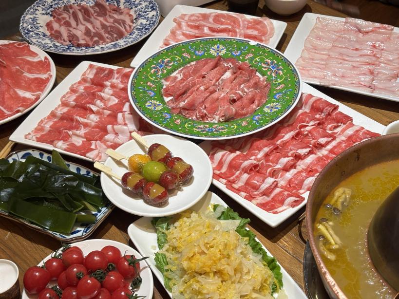 清水铜锅涮原切谷饲肥牛,肉嫩不柴;手切苏尼特羔羊卷涮后鲜嫩,麻酱蘸料香浓,搭配糖蒜解腻。