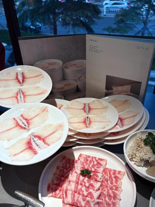 斑鱼片薄嫩,涮几秒即熟,汤底鲜醇;匠之鱼皮 Q 弹入味,炸腐竹吸满汤汁,搭配菌菇,涮菜口感层次丰富。
