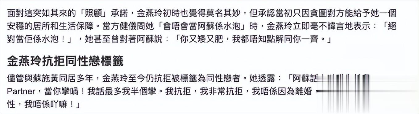 两段婚姻都是和男性,这让金燕玲始终坚信自己喜欢的是异性,即便和苏施黄同居多年,她仍然抗拒被贴上喜欢同性的标签。