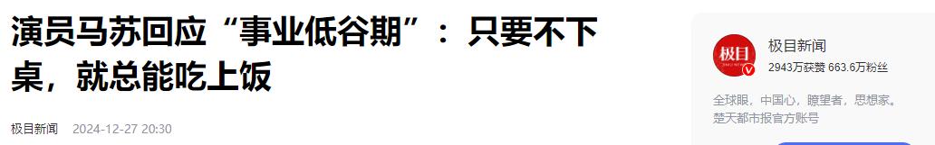 参考资料:极目新闻-演员马苏回应“事业低谷期”:只要不下桌,就总能吃上饭