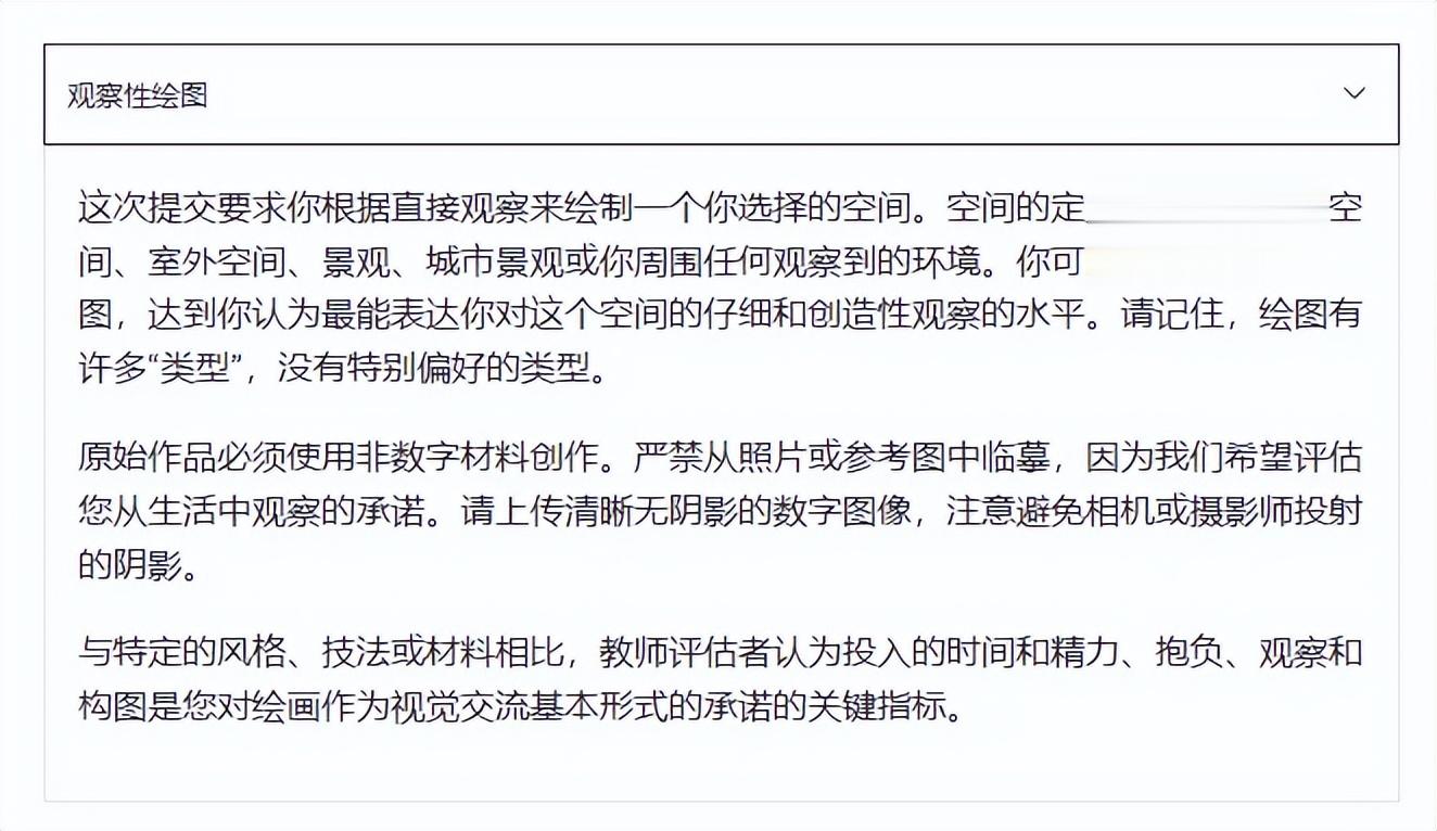 其中创意项目和观察绘画每年的题目都不同,比如今年的创意项目主题是“boredom(无聊)”,观察性绘画需要绘制你对“空间”的观察。