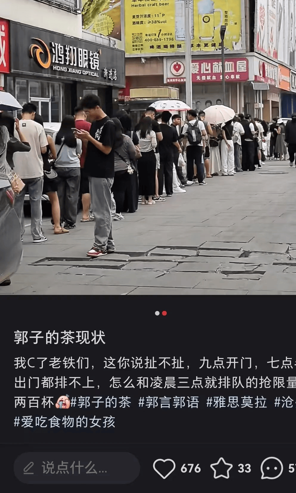 根据网友透露,这家名为“郭子的茶”的店铺,其实早在开业前两天就已排起惊人长队,队伍从街角一路延伸至另一端。有网友表示:“明明九点开业,七点半到都已经排不上了。”为应对汹涌客流,店家不得不连续实施限购:首日200单,之后两天每日500单——即便如此,人流依旧不见消退。