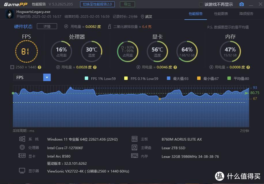 身为一个忠实的《哈利·波特》迷,我自然不能错过《霍格沃茨之遗》这款游戏。在实际测试中,即使在2K分辨率+最高的极致画质,B580 Photon默认开启XeSS品质模式,游戏也能能跑稳定跑到81fps。在制程工艺与芯片设计同步升级的情况下,蓝戟B580 PHOTON相较上一代A系列显卡的提升可以说是质的飞跃。