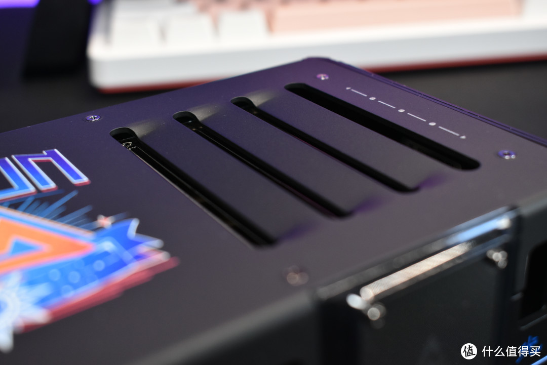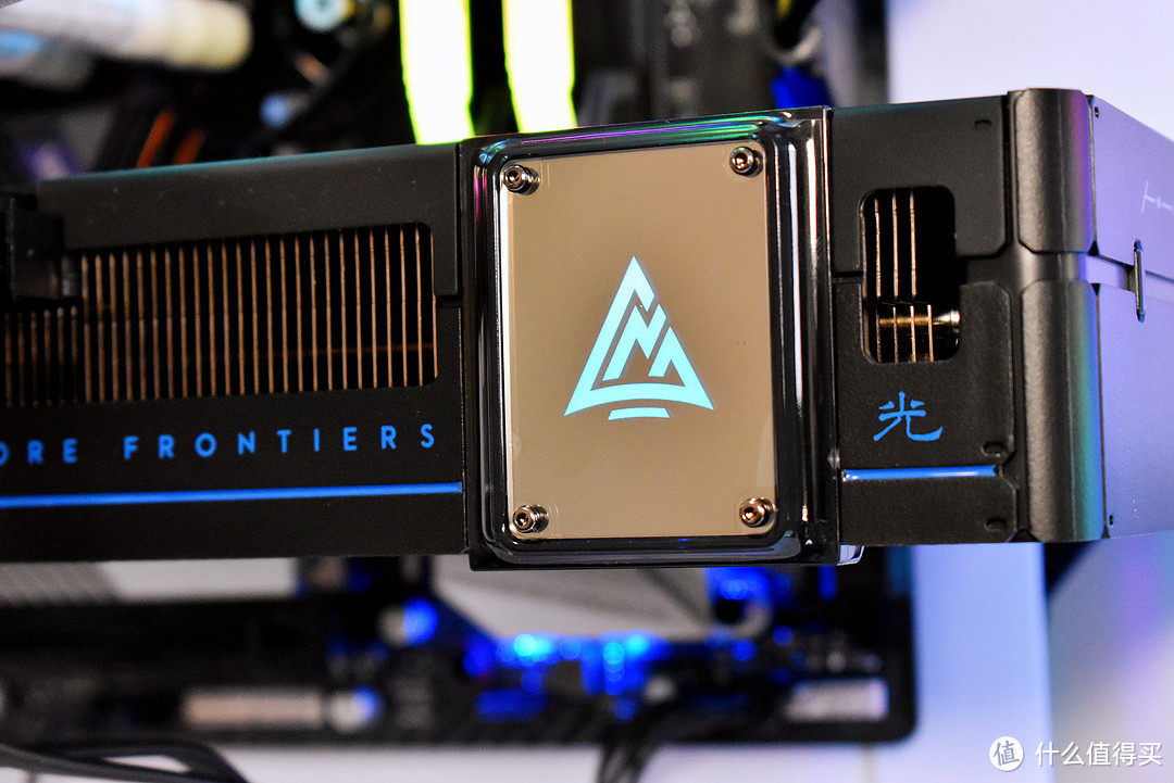 一抹蓝色腰线雕刻着EXPLORE FRONTIERS(探索边界)的Slogan和代蓝戟Photon系列的“光”字烙印。显卡侧面依旧布置了游戏玩家喜闻乐见的信仰灯。灯光还能根据电脑状况展示不同色彩,外接电源故障会显示红光,主板故障时会显示黄光,正常运作则显示蓝光,炫酷且实用。外形上相比前代,信仰灯面版四周给到了4颗螺丝固定,观感上很赛博朋克哦。