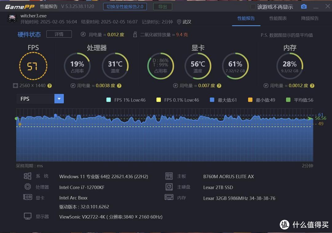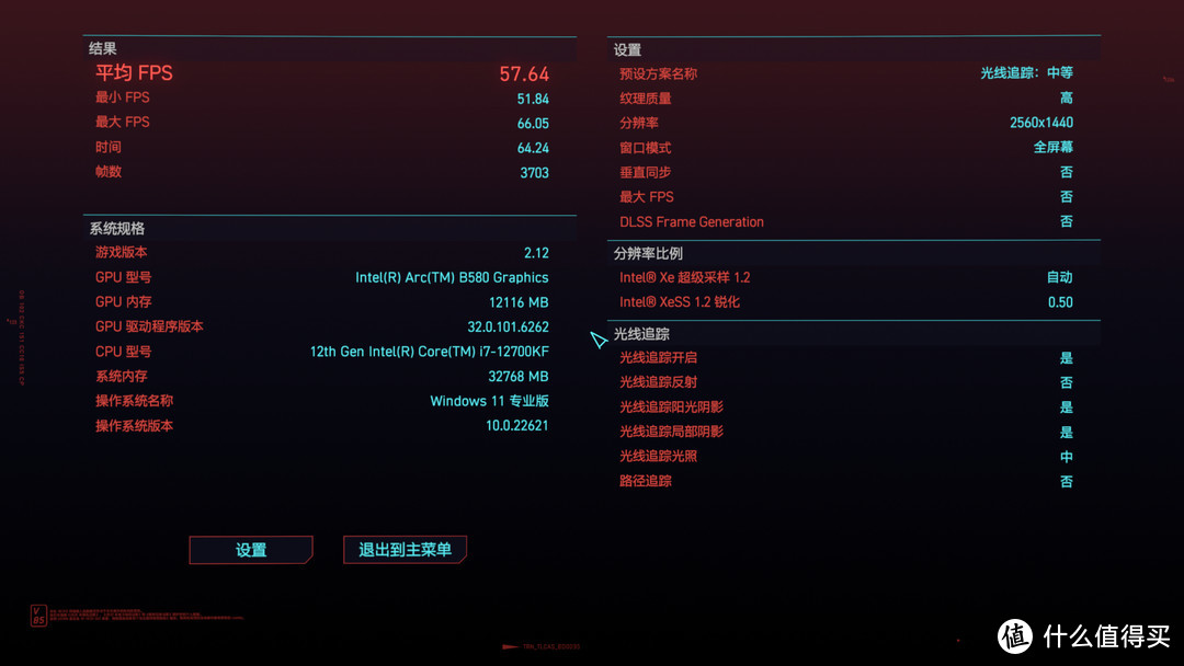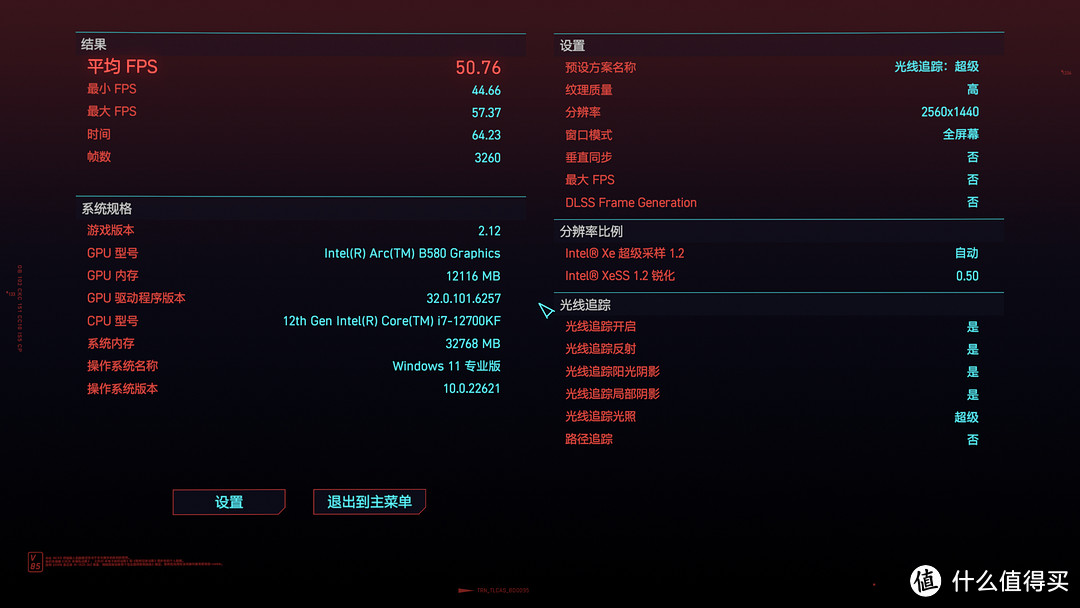 接着在《赛博朋克2077》游戏基准测试里尝试蓝戟B580 Photon的光追性能表现,2K分辨率+中特效光追的设置下,游戏平均帧数为57.64fps。2K分辨率+超值光追的设置下,游戏平均帧数为50.76fps,相交于上代英特尔显卡,光追性能强上不少,这个帧率游玩,实际是感受不到任何卡顿掉帧的。