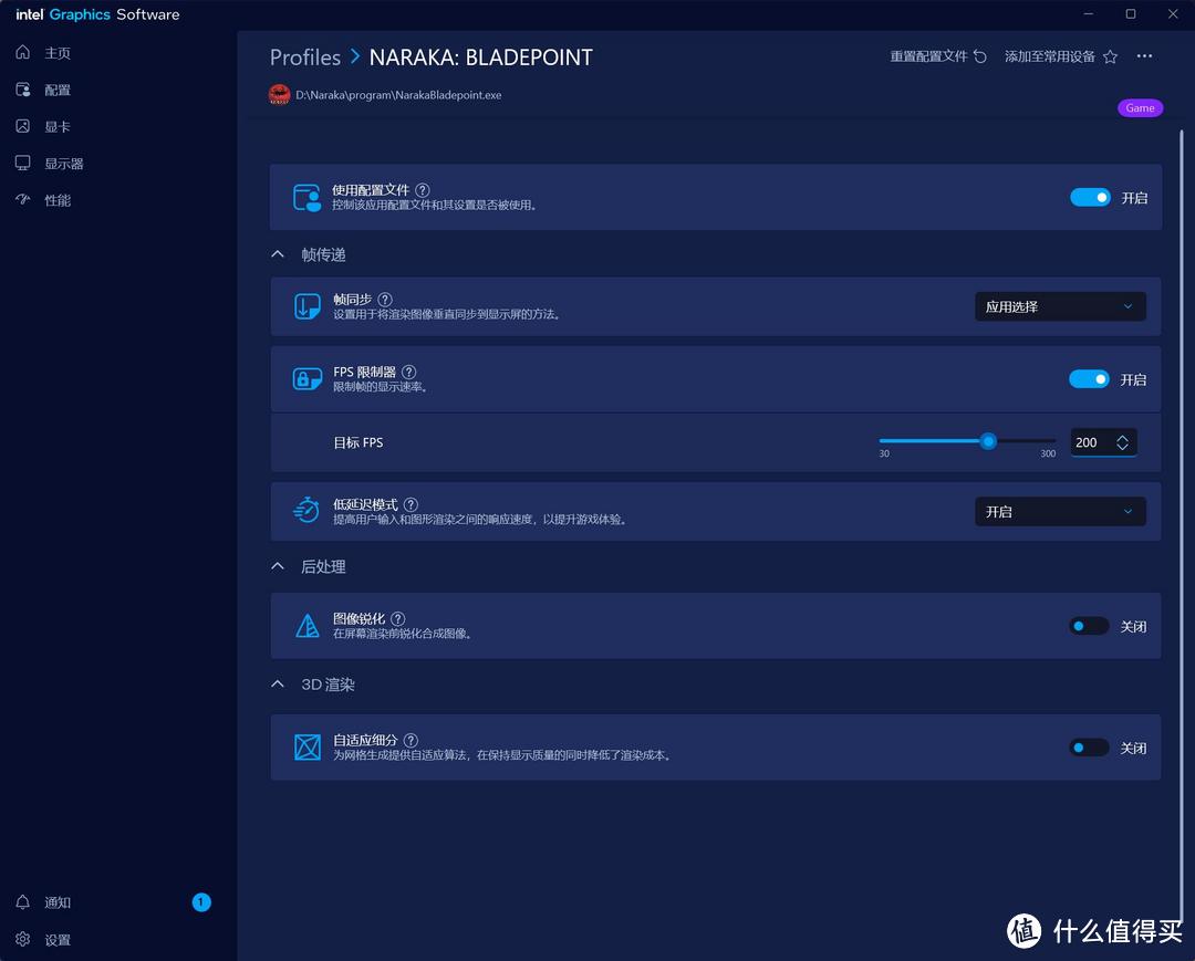 这次英特尔在配套软件上也做了显著改进,全新的Intel Graphics Software不但提供了更为友好的UI,还内置了低延迟模式和超频机制。对特定的游戏,配置了独立的功能选项,如帧同步、低延迟、图像锐化、各向异性扩散滤波、自适应细分等。