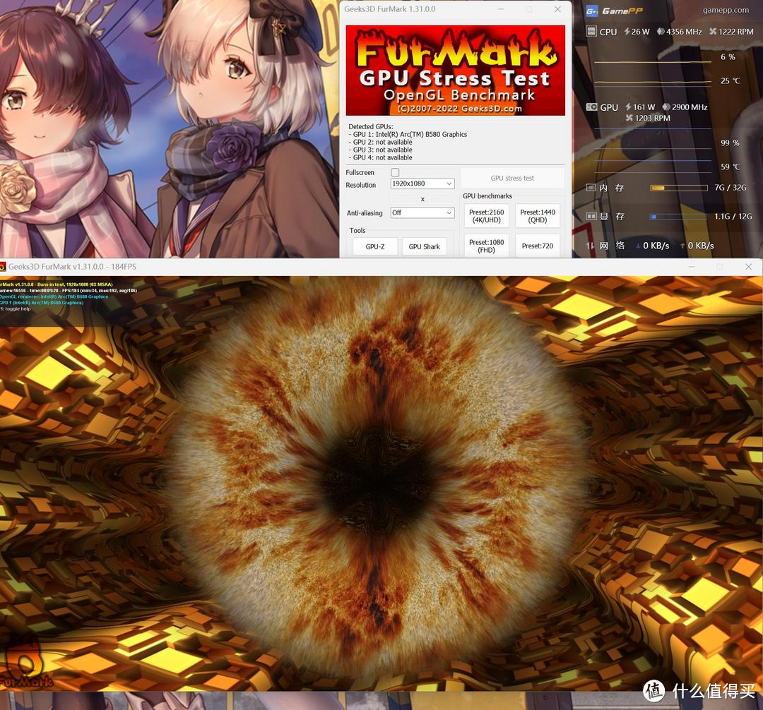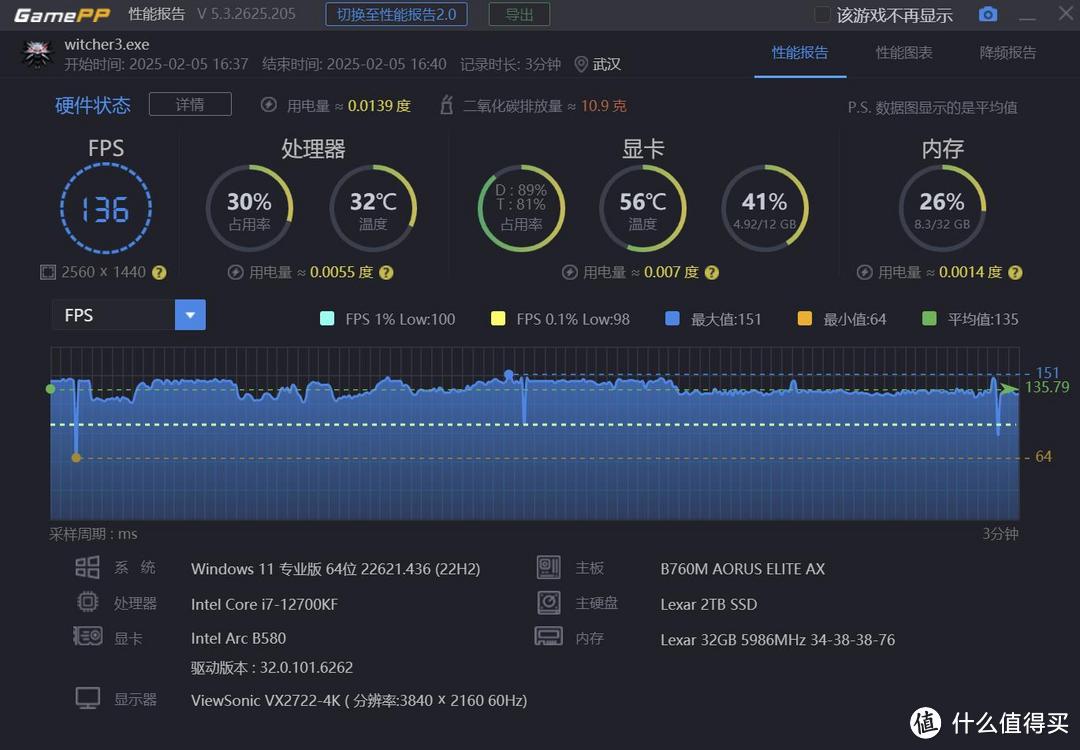 最后,在室温约20摄氏度环境中跑了下甜甜圈,蓝戟B580 Photon拥有强悍的幽刃三风扇+五根镀镍热管+高密度散热鳍片+先进制程架构的配合下,平均温度在57度,最高温度也仅为62℃,表现非常的不错,核心功耗(并非整卡功耗)约为160W上下。风扇转速仅1200~1400转/分钟,可以看出即使满载散热仍有许多余量,同时拥有良好的释放与低噪音表现。