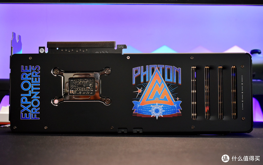 继而转向显卡的背面,依旧那坚固的金属背板,左侧镌刻着“EXPLORE FRONTIERS”,即“探索边界”的slogan,而右侧,则是蓝戟Photon系列的彩绘图腾,绚烂夺目。