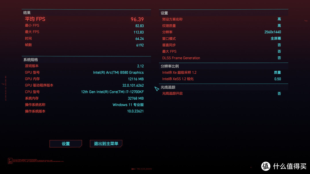 在2K分辨率下,《赛博朋克2077》以高画质运行,此时的XeSS会自动设置为质量模式,游戏平均帧数96.39fps,最大FPS为112.83fps,最小FPS为82.83fps,游戏中没有出现卡顿、画面撕裂等问题。