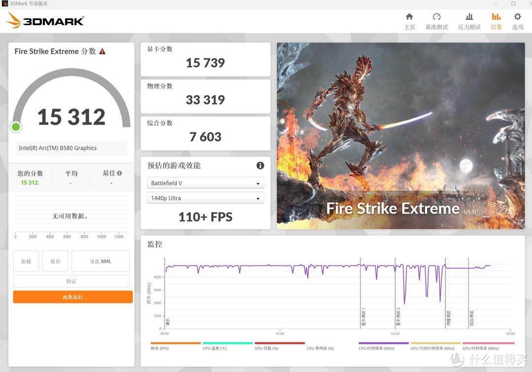Fire Strike Extreme项目是测试显卡在DX11游戏中2K分辨率下的性能指数。一轮跑分结束,这套配置的总体得分15312,其中蓝戟B580 Photon显卡得分15739,无论新旧网游,基本上闭眼开最高画质都是没问题的。