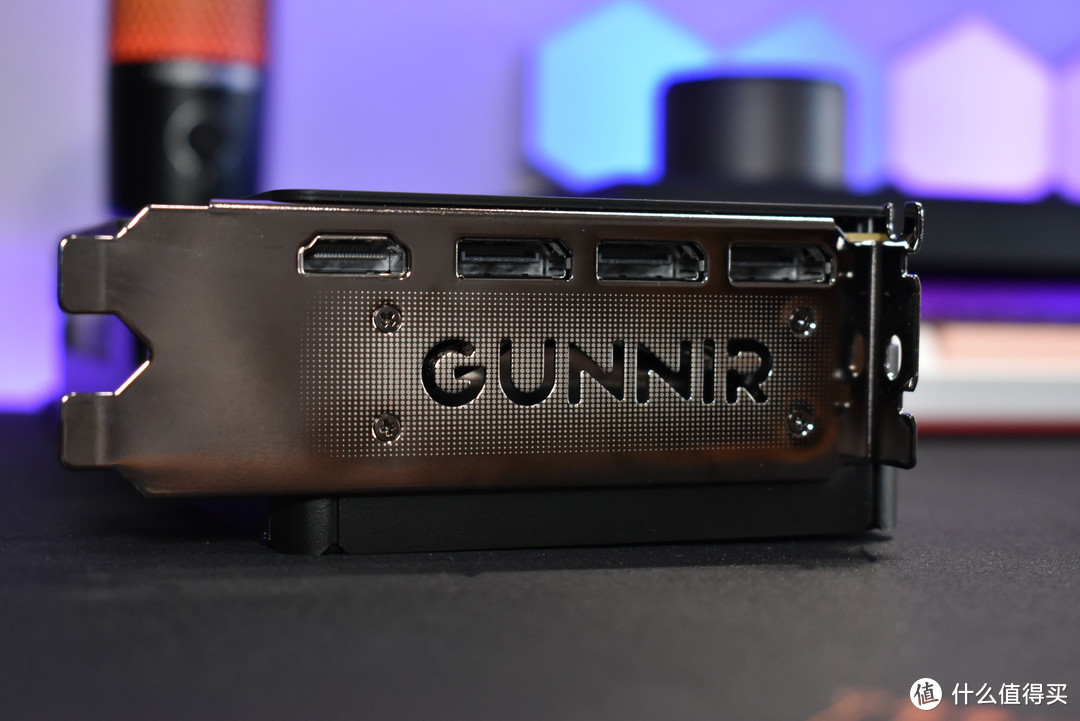 IO金属护板上GUNNIR镂空LOGO和延伸网纹,格外精致。作为主攻游戏和高负荷生产力的显卡,蓝戟intel Arc B580 Photon接口配置也相当丰富,提供了3个Display Port 2.1接口与1个HDMI 2.1接口,相交于上代产品也是进行了很大的升级。需要注意的是,中间的DP接口为UHBR13.5,原始带宽为54Gbps,电竞玩家推荐使用此接口,另外2个DP接口是UHBR10,原始带宽40Gbps。