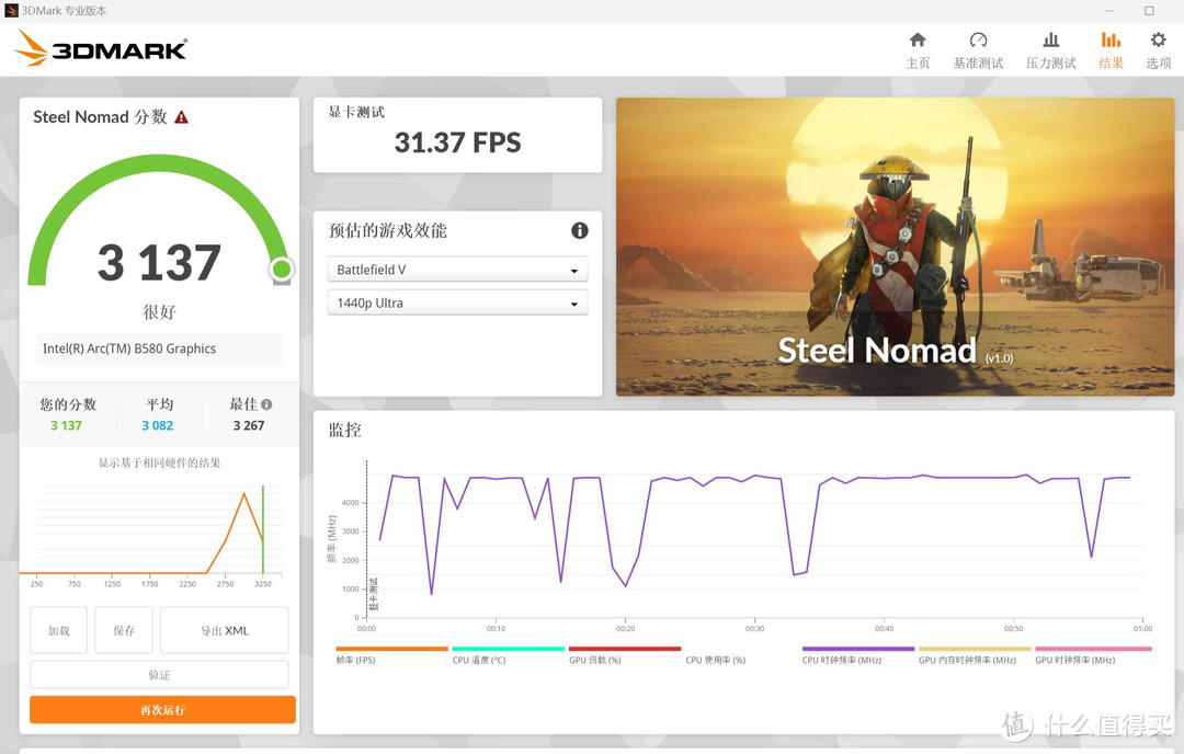 Port Royal是测试的显卡在2K分辨率下的实时光线追踪性能指数。 这次由于更新为改进型的20个Ray Tracing Unit光追单元,这套配置测试得分8033,平均帧率为37.19fps, B580 Photon光追实力挺不错,当然也期待i卡能继续优化,继续发力。