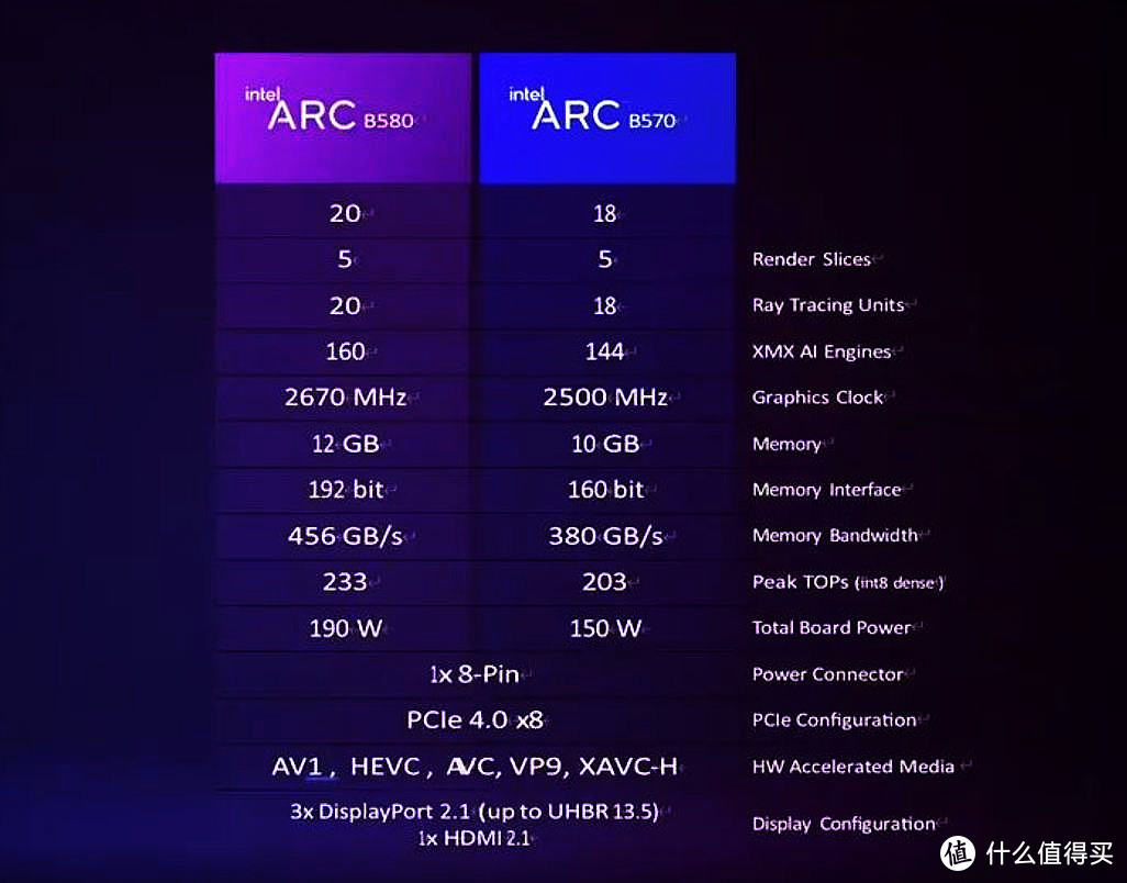 接着来看下这张B580的具体参数,采用的是BMG-G21 GPU,它拥有5组渲染切片,20个Xe核心,160个XMX矩阵引擎,20个光追单元,10个像素后端和20个像素采样器,拥有18MB L2缓存,2个Xe媒体引擎。