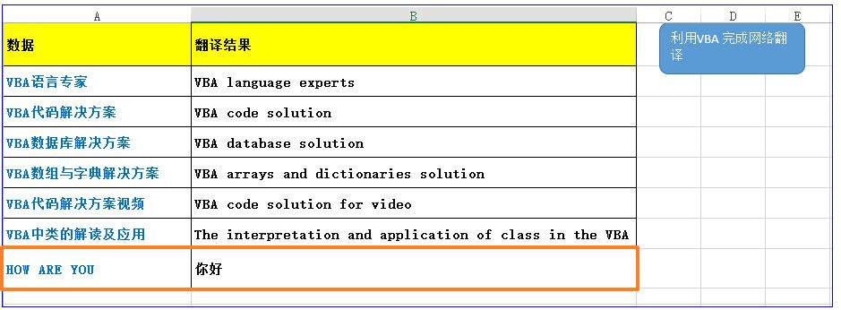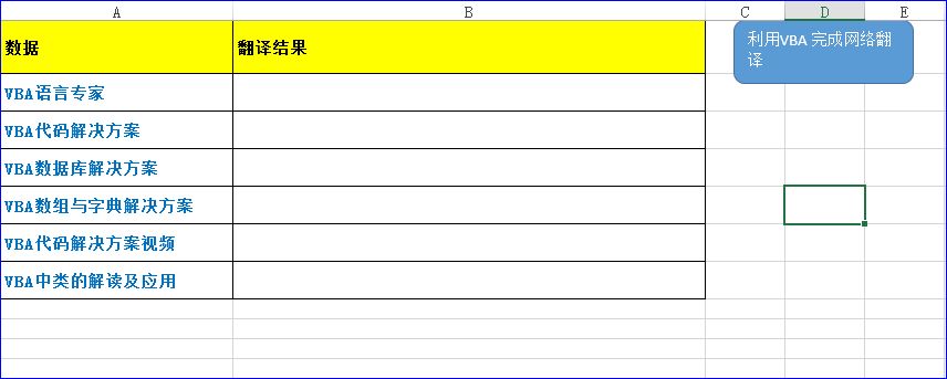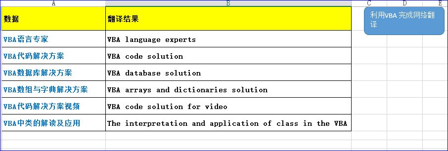 实现场景:在工作表中有一组关键词我们要实现网络的翻译,并把结果放到对应的单元格中。如下图,要求是当我们点击运行按钮时,即刻可以实现翻译。