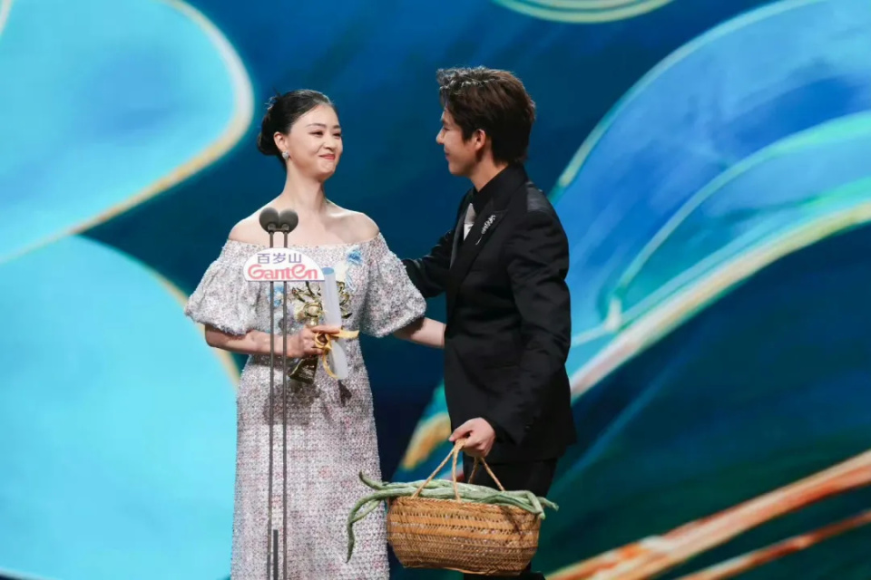 首先要恭喜在提名了三次白玉兰奖之后终于拿到了第一个,并且是第一次拿到了主流奖项认可的蒋欣。给蒋欣颁奖的就是在这部剧当中饰演蒋欣儿媳妇的关晓彤,主持人王安宇在这部剧中饰演她儿子。老妈得了奖,儿子屁颠颠送上来了剧中的灵魂道具蛇瓜。一边上台还一边喊着说:“妈,我给你带了点蛇瓜。”