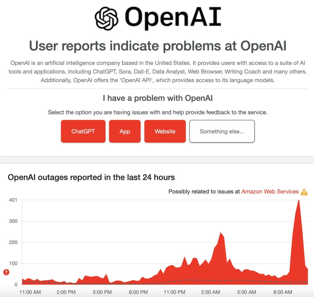 由于亚马逊AWS服务器宕机,大量互联网服务被迫中断,ChatGPT也被殃及。