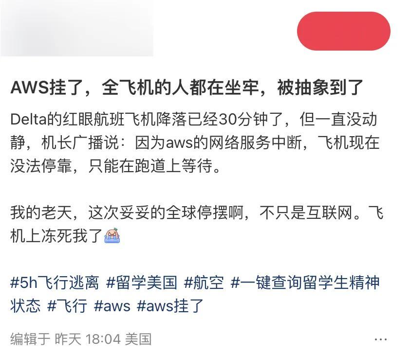 比上不了飞机更惨的是在飞机上下不去,小红书上就有网友现身说法,表示自己乘坐的达美航空班机落地后无法停靠,一飞机的人只能在跑道等待,机长广播通知原因正是亚马逊宕机。