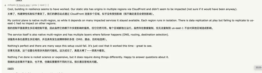 Hacker News上就有网友表示,其静态站点通过CloudFront连接多个区域,没有全部押注us-east-1,因此在这次事件中没有受到影响。