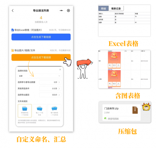 收集的内容可按姓名分类打包,省去手动重命名、整理的时间,各种数据还可一键导出Excel表格或压缩包,高效留痕、方便工作复盘。