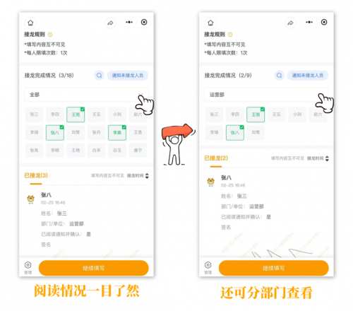 接龙进度实时可控,还能分部门查看接龙情况,大幅提升团队协作效率,职场人再也不用被低效的收集工作内耗。