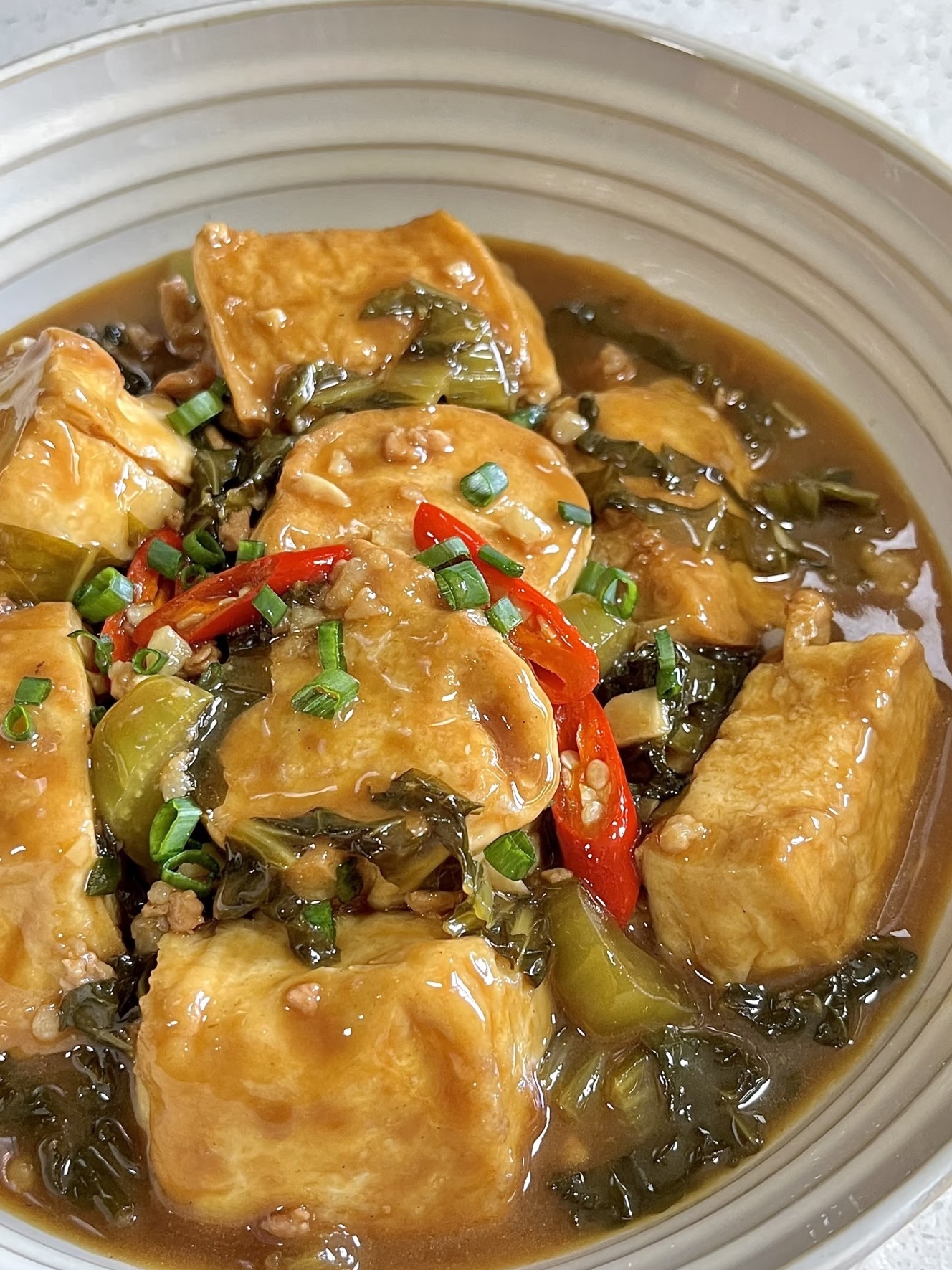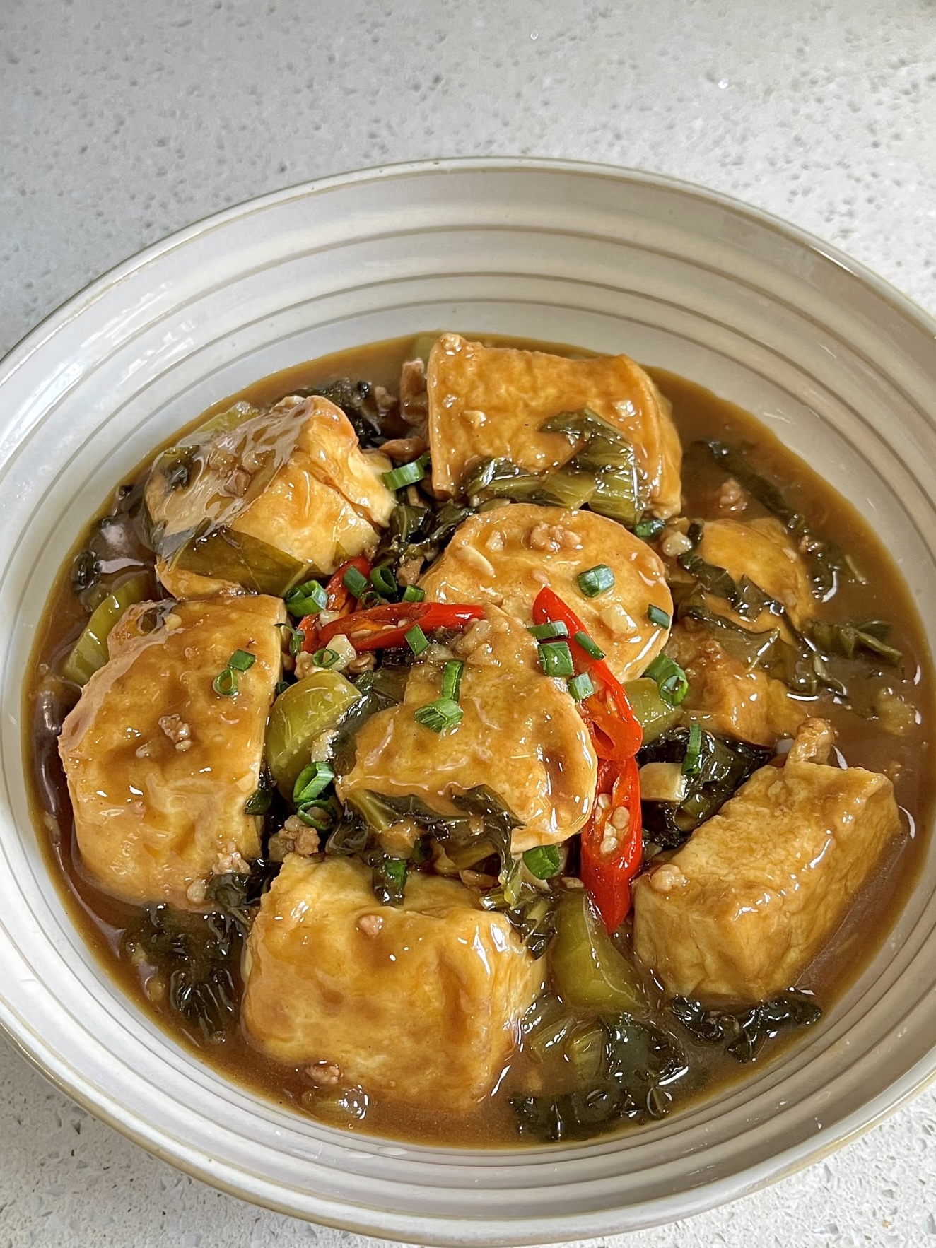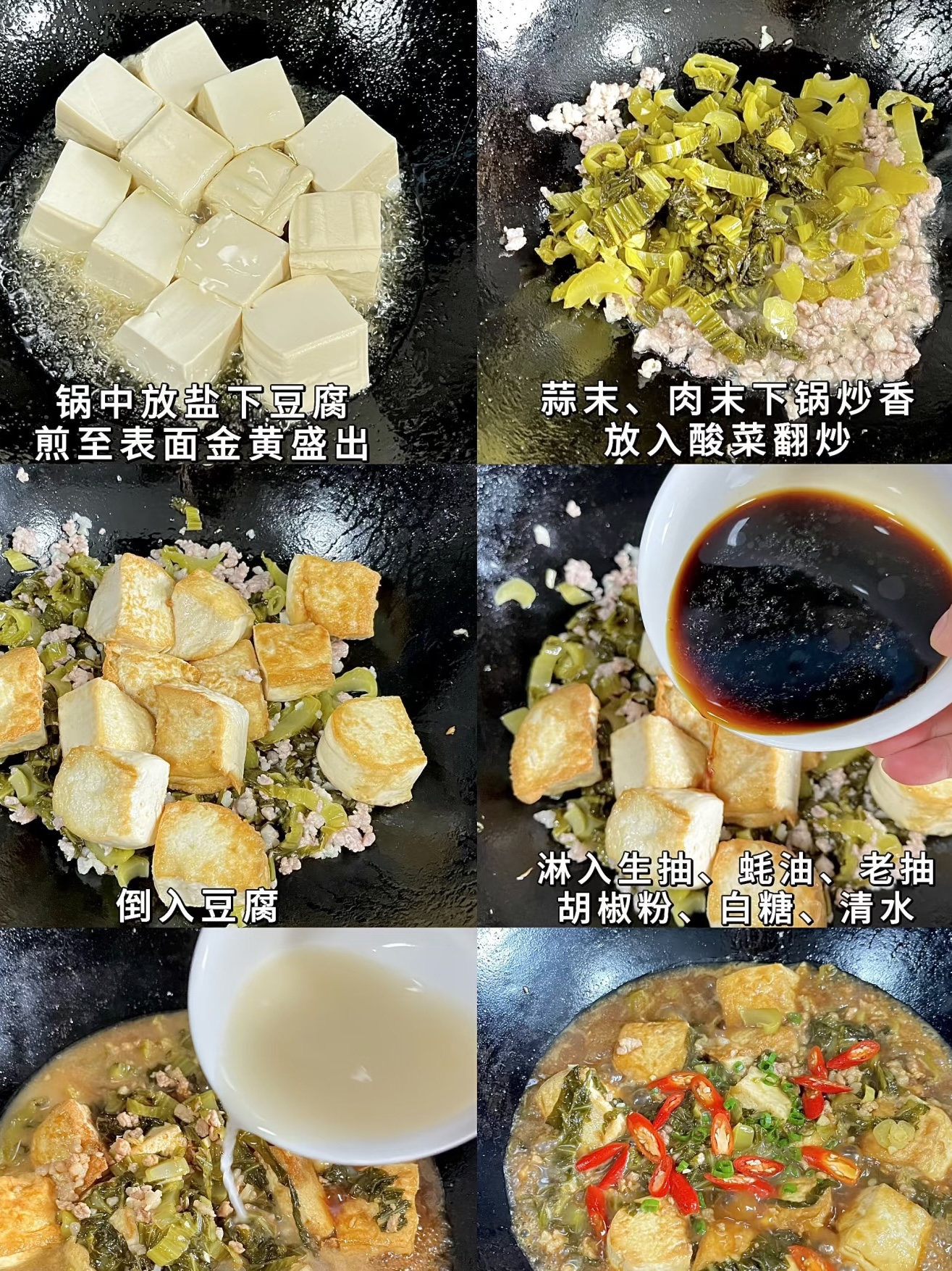 调酱汁只需“三剑客”:生抽一勺提鲜、蚝油半勺挂汁、老抽几滴上色,再撒点白糖中和酸味,胡椒粉增香。别学餐厅猛加味精,酸菜本身自带鲜味。酱汁一淋,酸菜瞬间油亮,像给砂锅剧开了美颜。把煎好的豆腐轻轻推进去,加半碗清水,汤汁刚没过锅底就行,豆腐会再出水。盖上锅盖,中火焖五分钟,让豆腐像海绵一样吸饱酸辣汁,时间别太长,否则豆腐变蜂窝,口感老。