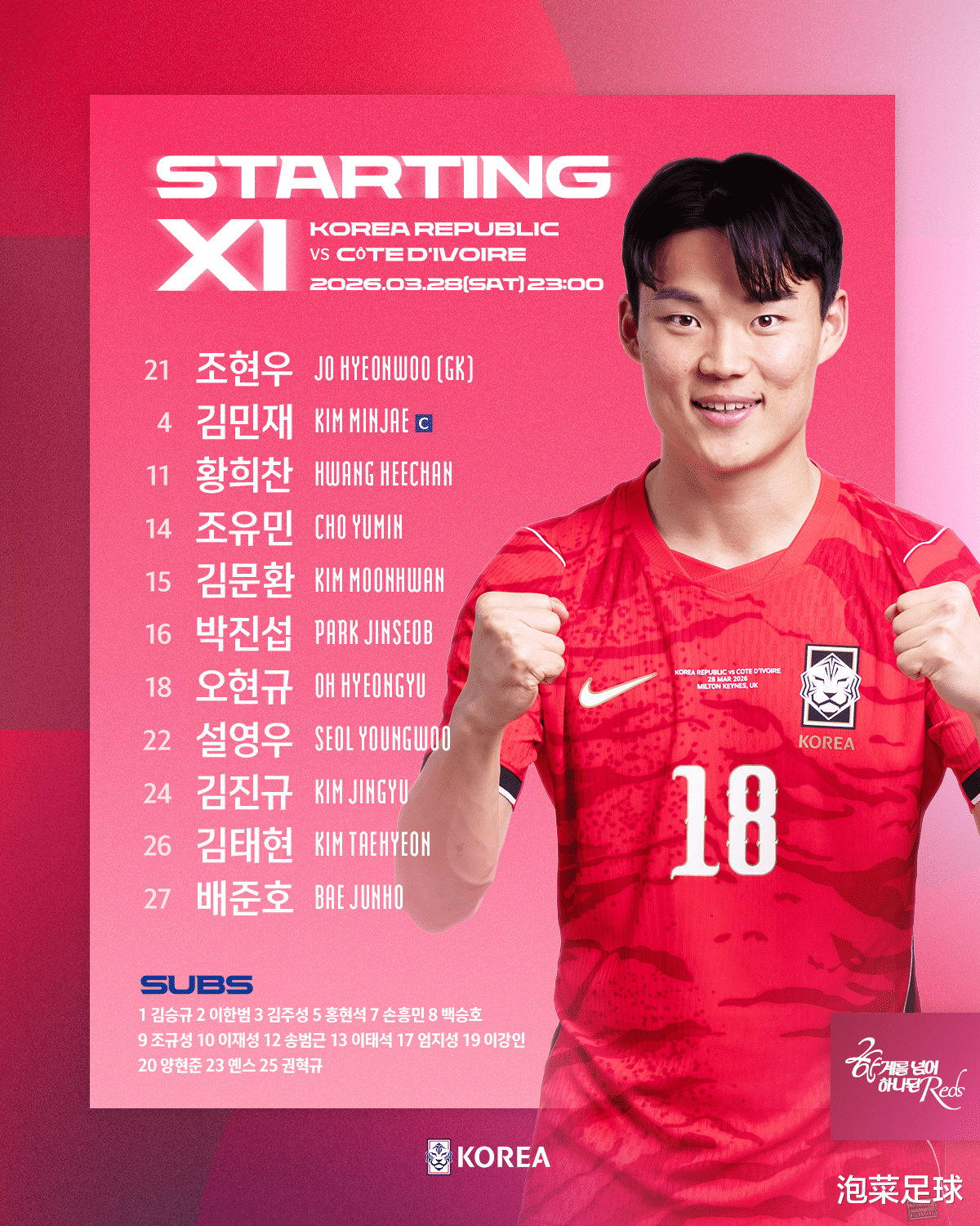 附:韩国与科特迪瓦热身赛首发(3.28日)