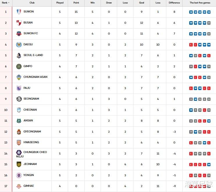 积分榜上,水原三星、釜山、水原FC分列前三位,大邱虽然位居第四,但已经和前面拉开了“一场”的分差。而新军金海FC2008本轮轮空后,依旧成为K2联赛唯一一支未取得分数的球队。