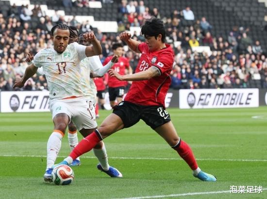 本场比赛,洪明甫如他所愿排出了一个3-4-3阵型:门将赵贤祐,三中卫由金太炫、金玟哉和曹侑珉组成,左边翼卫薛英佑,中场朴镇燮搭档金镇圭,右边翼卫金纹焕,左边前卫裴俊浩,右边前卫黄喜灿,单箭头吴贤揆。开场阶段,韩国队压迫凶猛,薛英佑与金纹焕一度压至对手大禁区前沿。然而双方试探过后,科特迪瓦开始利用其身体与速度优势主打边路。他们在实战中发现,虽然薛英佑镇守的左路活动范围大、身后空档也不小,但他的身体对抗与回追速度毫不逊色;而右路的金纹焕与右中卫曹侑珉之间则暴露出更大空档,金纹焕在速度和身体对抗上均处于劣势。于是,科特迪瓦集中火力猛攻韩国右路,并通过高位逼抢迫使曹侑珉两次出现致命失误,导致丢球。