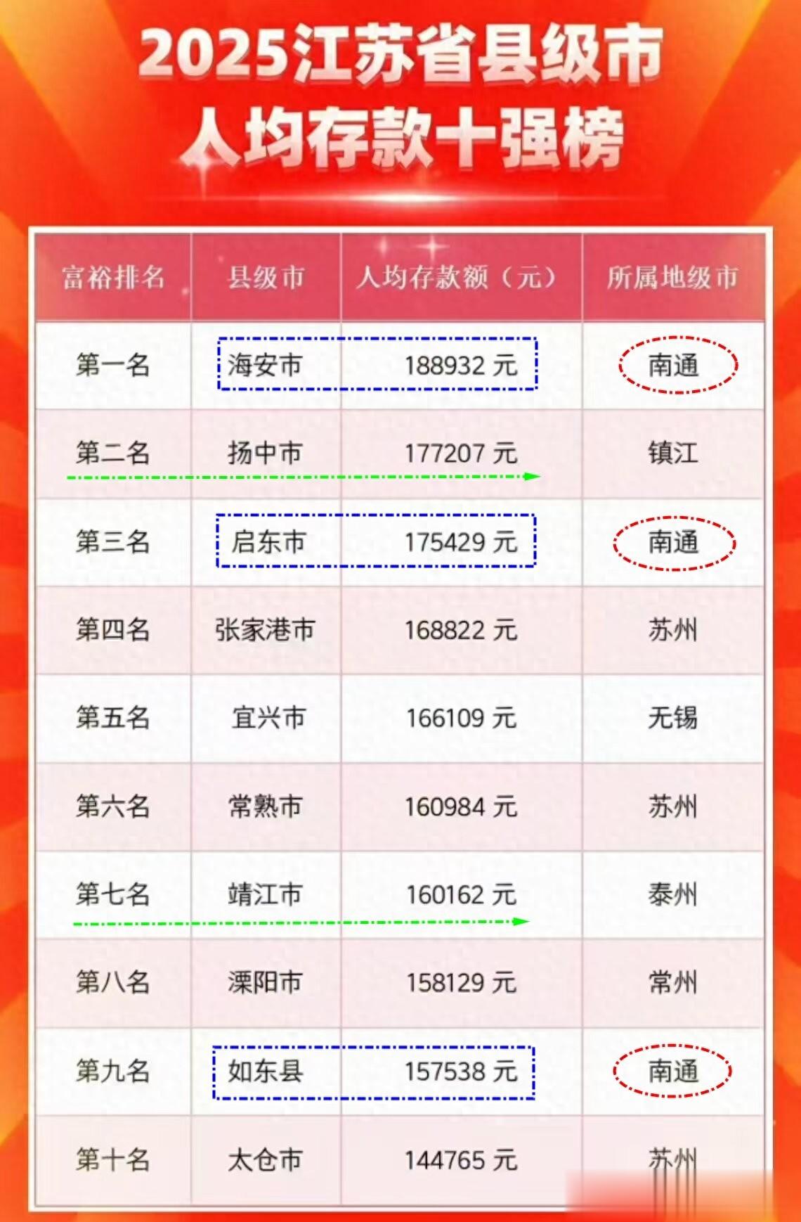 2025年的数据,江苏人均存款最多的十个县,苏锡常还是占据了半壁江山,共五席。