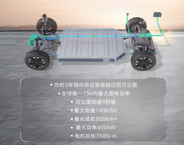 依托超能纯电平台M.A.P,可以适配单电机、双电机。还拥有全球唯一15kW的最大放电功率、800V充电电压和两分钟快速充电、800kg的最大承载、3000kg的最大拖拽能力和280mm最大离地间隙。