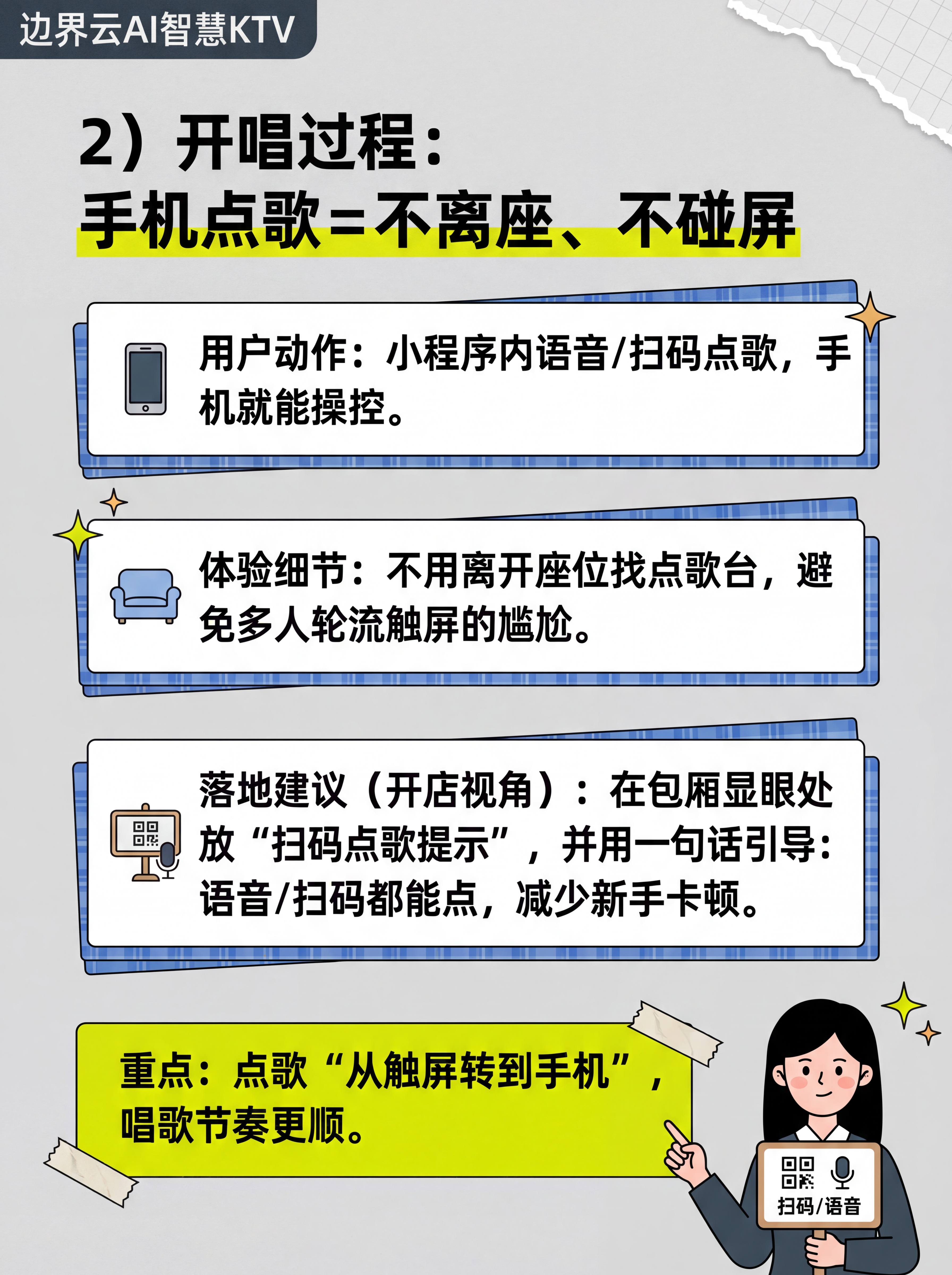 有个小细节值得注意:包厢显眼处贴个提示牌——"手机点歌,语音扫码都行"。就这一句话,能让第一次来的顾客秒变老手,少叫几遍服务员。服务员省事了,顾客体验也好了。