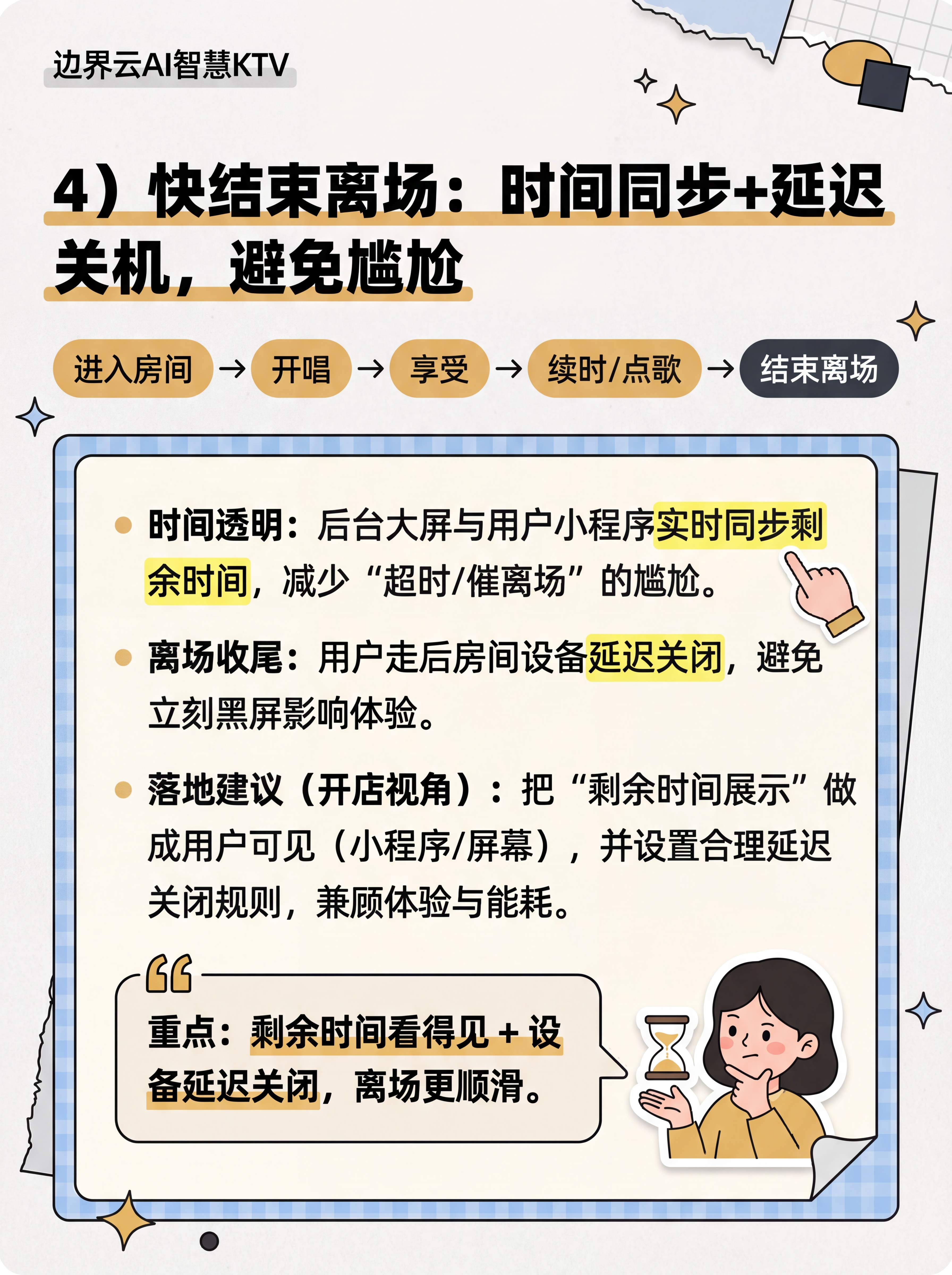 现在房间大屏和顾客手机实时同步剩余时间,大家心里都有数。快结束了,自己看着安排,不用人催。想续时就续,想走就走,全程自己做主。