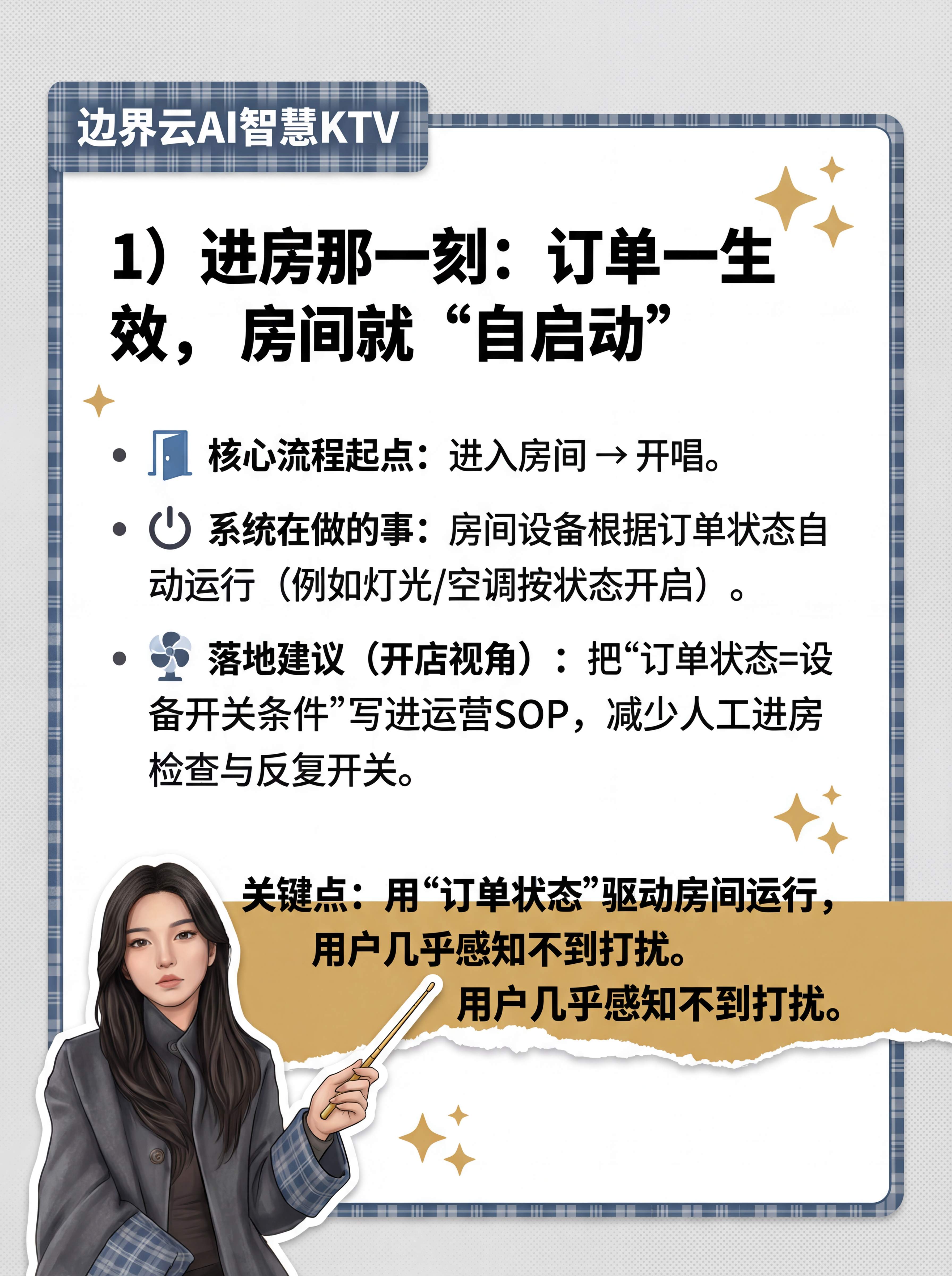 干过KTV的都懂,最怕啥?旺季忙起来,顾客到店了,房间还没准备好。服务员跑着去开灯、开空调、开设备,顾客在前台干等。还没开唱呢,印象分先扣了一半。