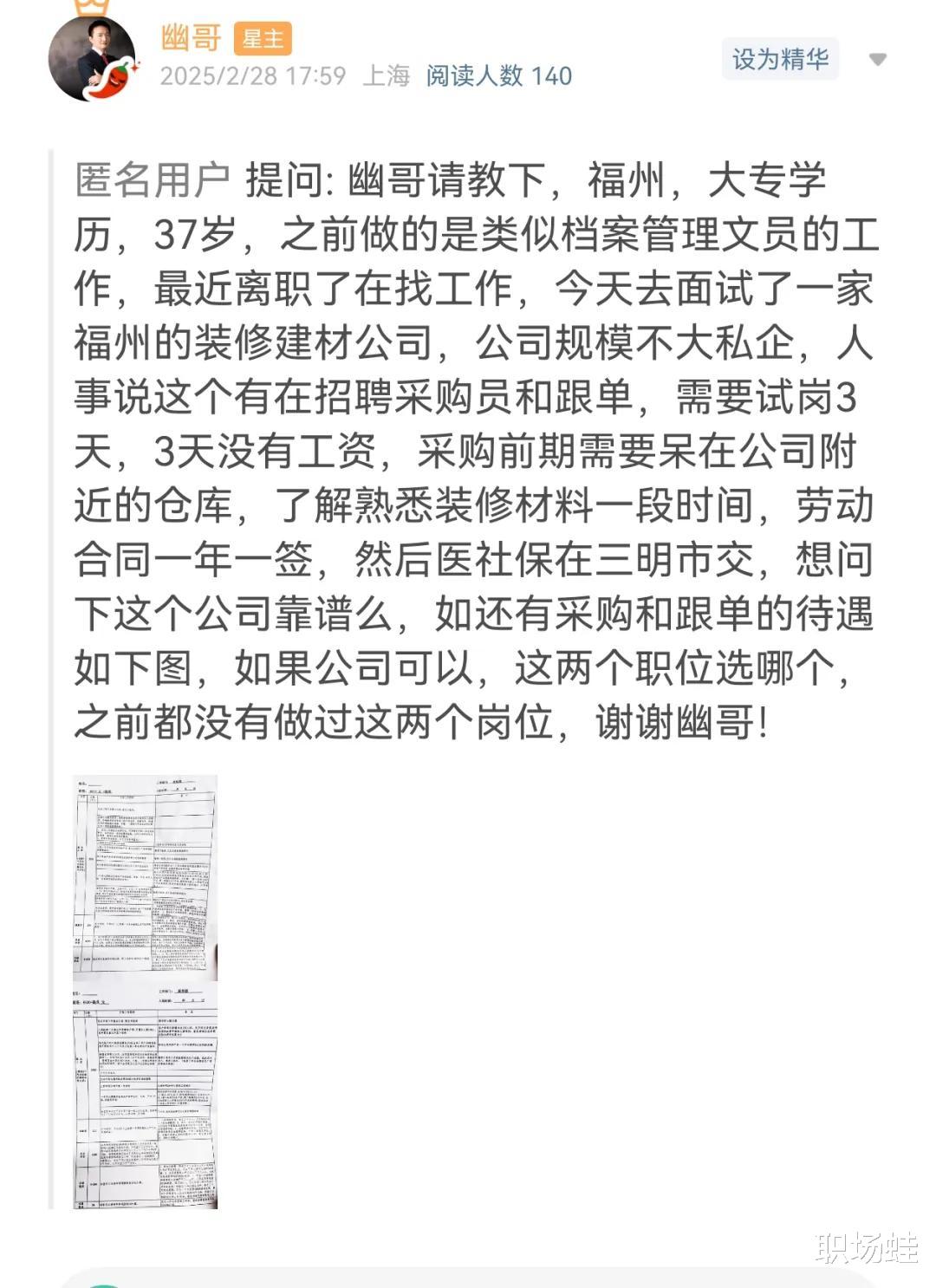 “今天去面试了一家福州的装修建材公司,公司规模不大私企,人事说这个有在招聘采购员和跟单,需要试岗3天,3天没有工资,采购前期需要呆在公司附近的仓库,了解熟悉装修材料一段时间,”