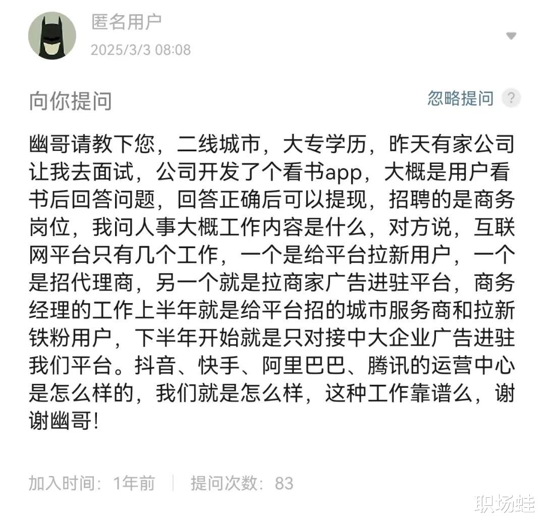 “招聘的是商务岗位,我问人事大概工作内容是什么,对方说,互联网平台只有几个工作,一个是给平台拉新用户,一个是招代理商,另一个就是拉商家广告进驻平台,商务经理的工作”