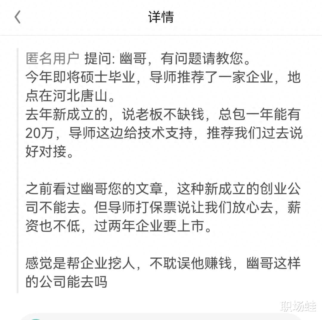 “幽哥,有问题请教您。今年即将硕士毕业,导师推荐了一家企业,地点在河北唐山。去年新成立的,说老板不缺钱,总包一年能有20万,导师这边给技术支持,推荐我们过去说好对接。”