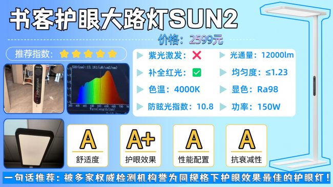 那么大路灯护眼灯是智商税吗?儿童护眼大路灯哪个牌子好?如果对于预算有限但又想要一步到位,追求的是极致的护眼体验的家庭来说,书客SUN2一定是首选(追求高标准极致护眼选书客SUN Pro小太阳)。它继承了书客品牌的核心光学技术,光线舒适度和护眼表现远超同价位产品,性能配置、护眼效果双双在线。