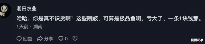一位湖南网友笑道:“哈哈,你是真不识货啊!这些鳑鲏,可算是极品鱼啊,亏大了,一条1块钱……”
