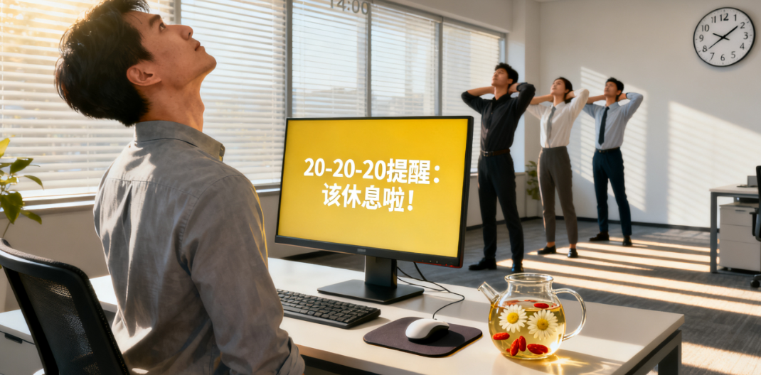 • 遵循“20-20-20”黄金法则:这是缓解视疲劳最有效的方法。每连续使用屏幕20分钟,就抬头看20英尺(约6米)以外的物体,至少20秒。