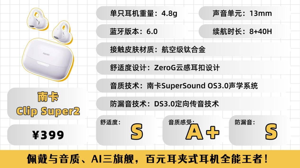 南卡在开放式声学这一块深耕了15年,是行业里少数一直坚持做自研声学系统和结构设计的厂商!它并不是靠堆宣传拉热度,而是靠足够扎实的技术积累和严苛的品质把控站稳市场。Clip Super2就是建立在成熟体系上的升级版,从声学方案、蓝牙系统到佩戴结构都经过重做和优化。上市后很快就出现在各种销量榜和测评榜前排,属于百元级耳夹式耳机里综合表现最稳定的一类,在运动群体和音频爱好者中获得了相当高的认可度!