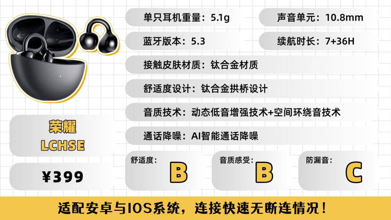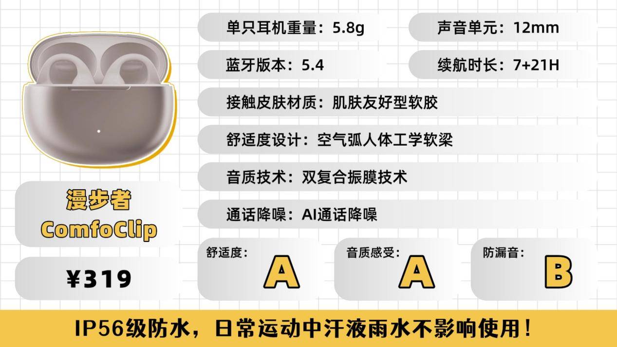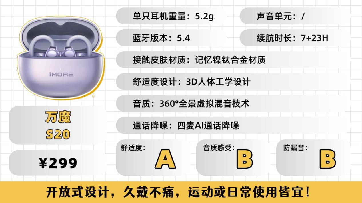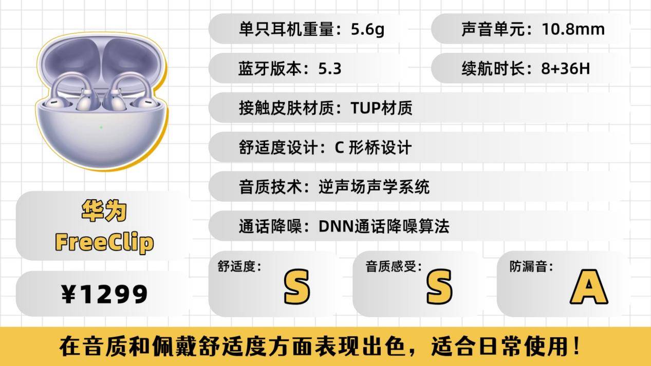 推荐理由:佩戴轻松舒适,音质平衡,开放式设计保持外界感知,适合通勤和轻运动