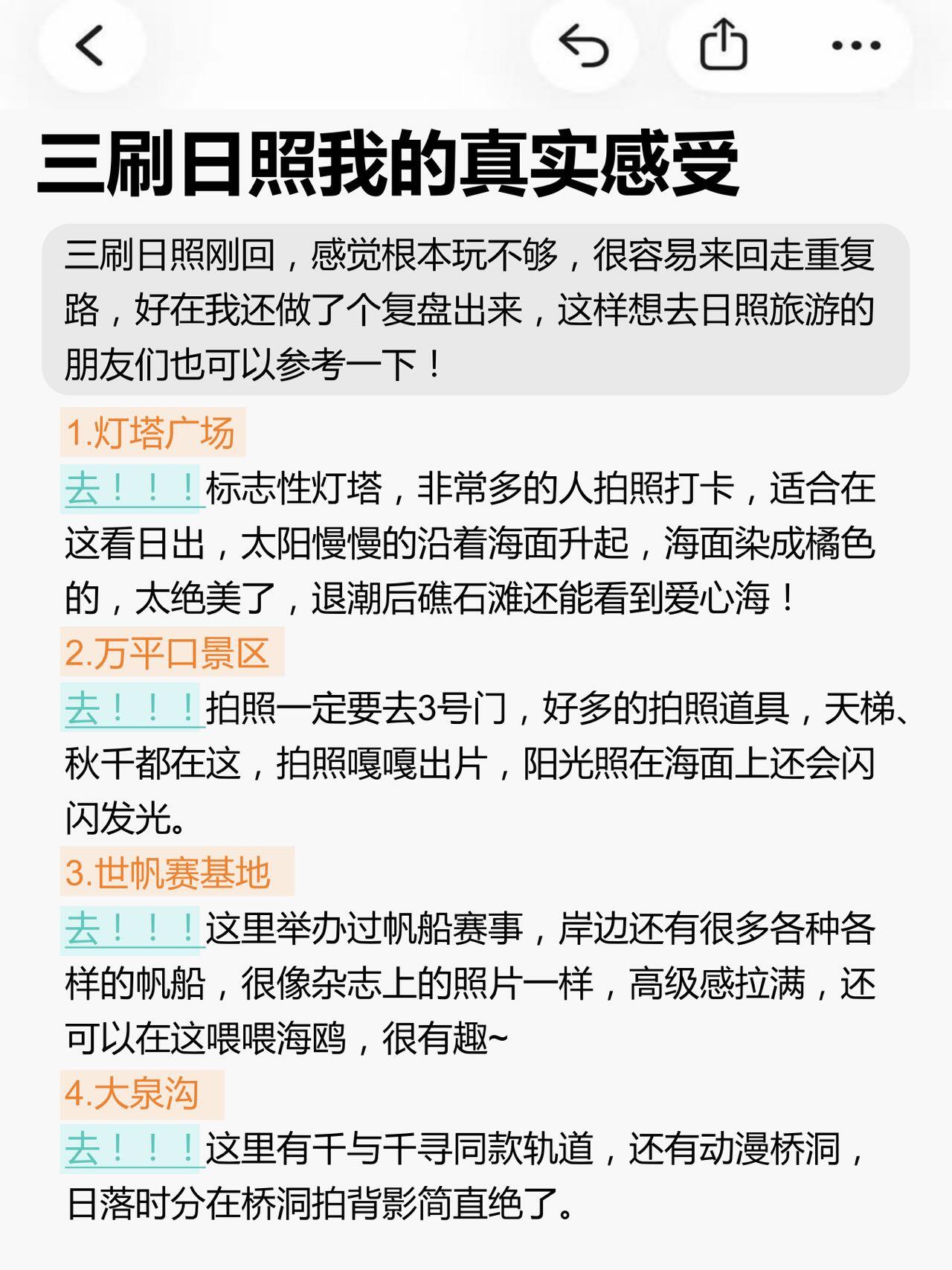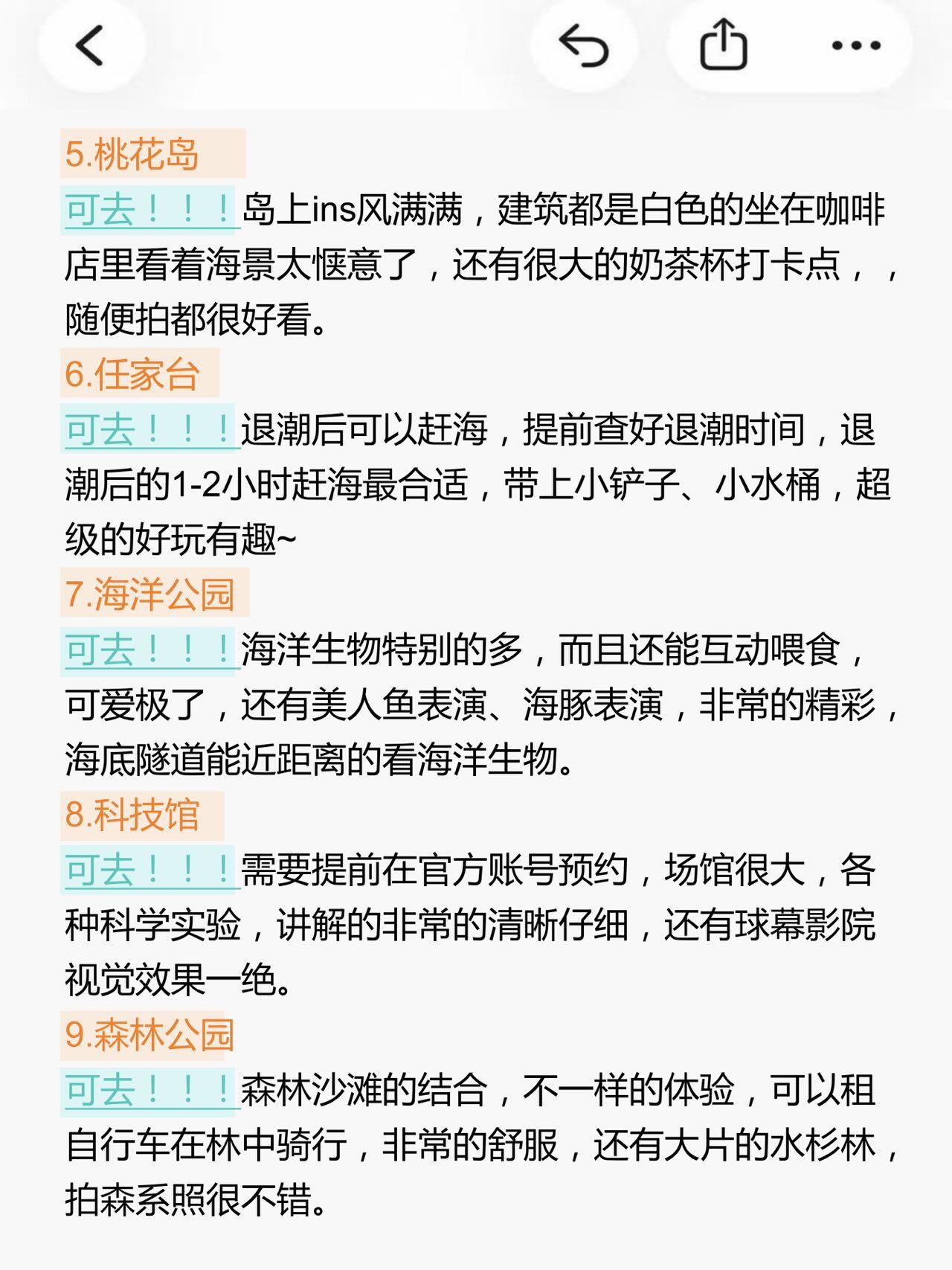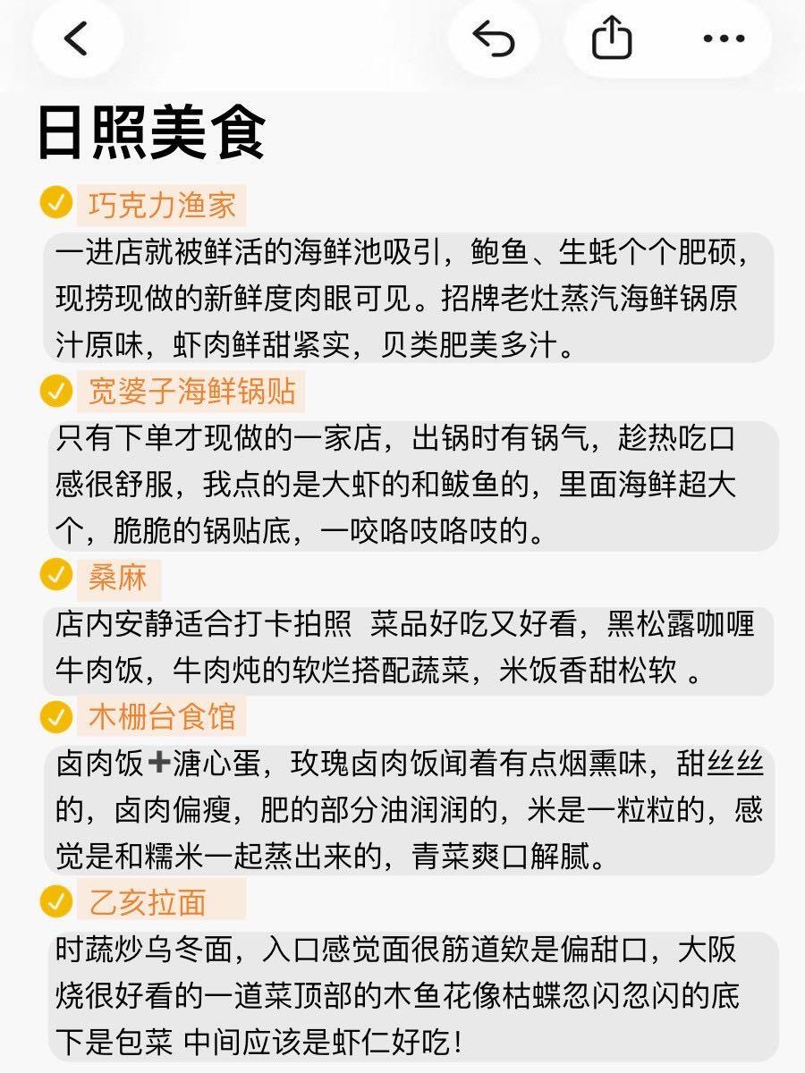 第一天:首先去了日照海滨国家森林🌳公园,森林和沙滩完美结合,沙子细得像面粉一样,走上去软绵绵的。我们还租了双人自行车🚲,在林间小道上骑车很惬意,接着去了任家台,这里退潮后礁石🪨缝里全是小螃蟹和海螺,然后沿着去了阳光海岸打卡了周杰伦歌词墙、白色旋转木马🎠,随手一拍就是大片,然后去了桃花岛,白色建筑配上蓝色大海,有种在地中海的错觉,坐在海边吹着风🌪️喝咖啡,惬意到不行。傍晚时分到了大泉沟渔港,刚好赶上渔船🚣归港,好多海鲜,可给我馋坏了,我们一直决定出发去巧克力渔家吃海鲜🦞,蒸汽海鲜锅必点,活蹦乱跳的海鲜直接蒸,吃起来肉质特别紧实,蘸上特制的料汁很爽口~香辣石斑鱼🐟鱼肉嫩,鱼特别大一条,他们家家常菜也做的挺好吃的!